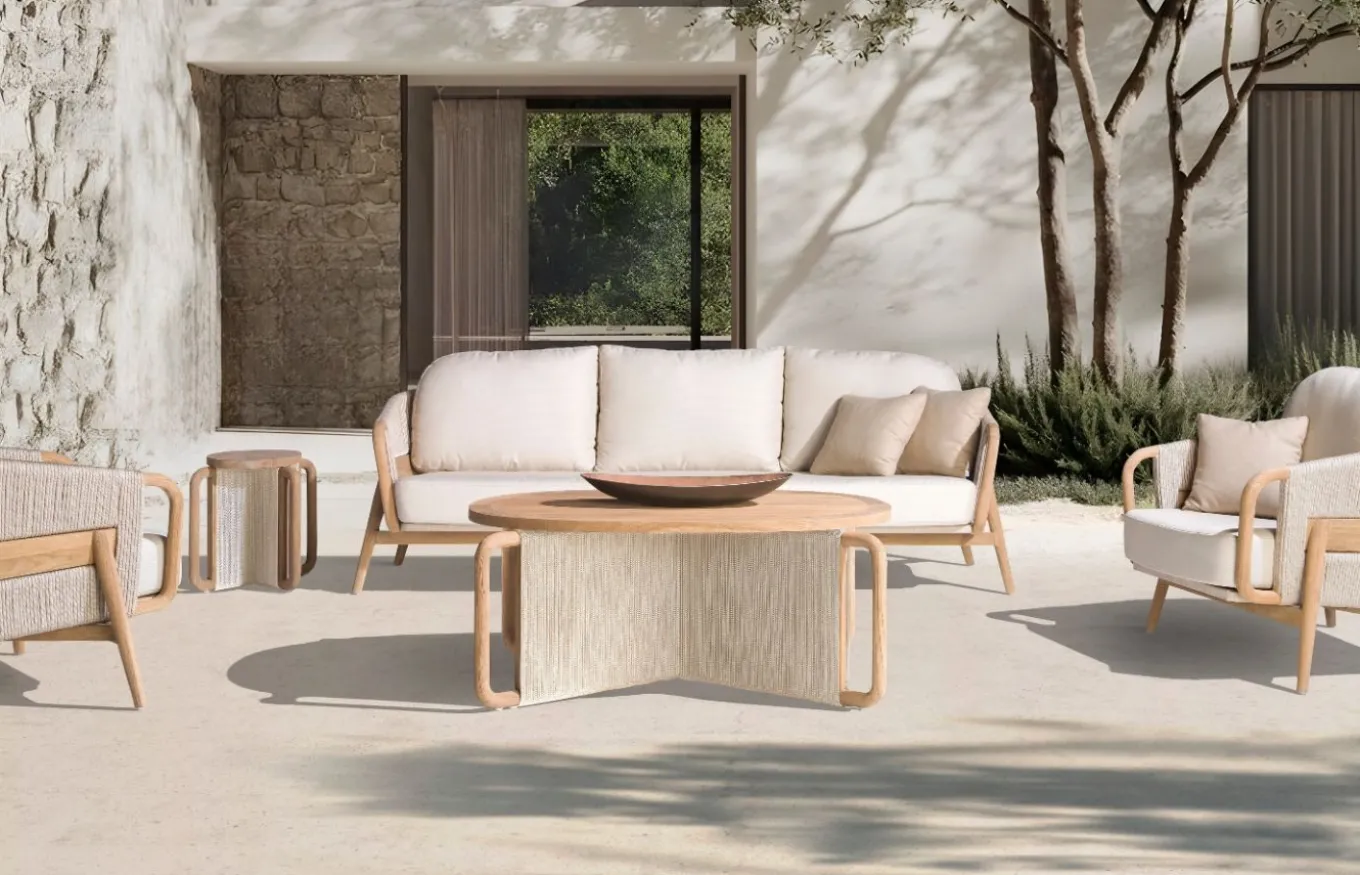 La colección de exterior Desire de Joenfa ofrece muebles cálidos y funcionales para jardines y terrazas, fabricados con materiales de alta calidad. La colección está diseñada para resistir las inclemencias del tiempo y brindar confort. Joenfa es una empresa española especializada en mobiliario de interior y exterior, destacando por su uso de materiales naturales y sostenibles como la teca reciclada y fibras artesanales.