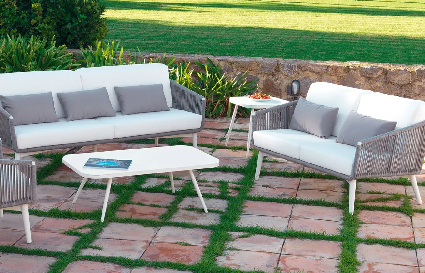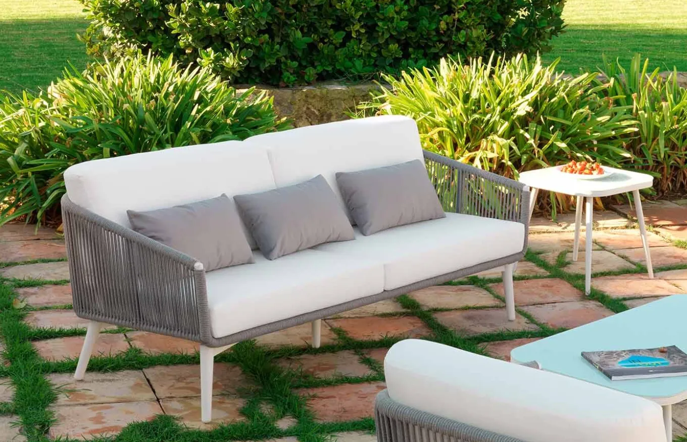 Sofá de exterior Siena de estilo colonial. El mobiliario de jardín con acabado en cuerda de poliéster y cojines tapizados lisos puede ser una opción con estilo para su espacio al aire libre.