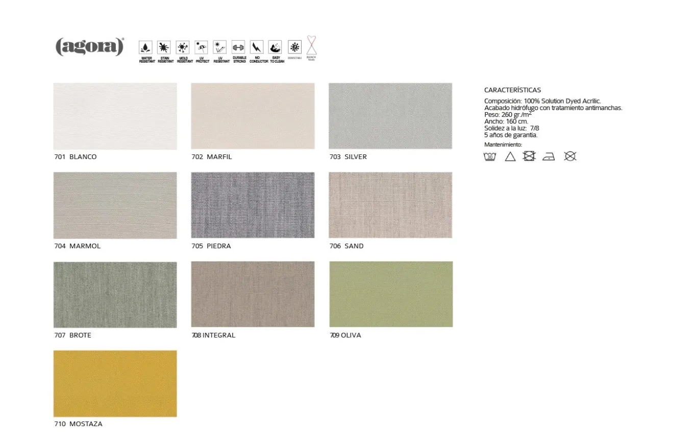 - Tapizado: Agora Liso, 100% Acrílico Tintado en Masa. Ver imagen de acabados.