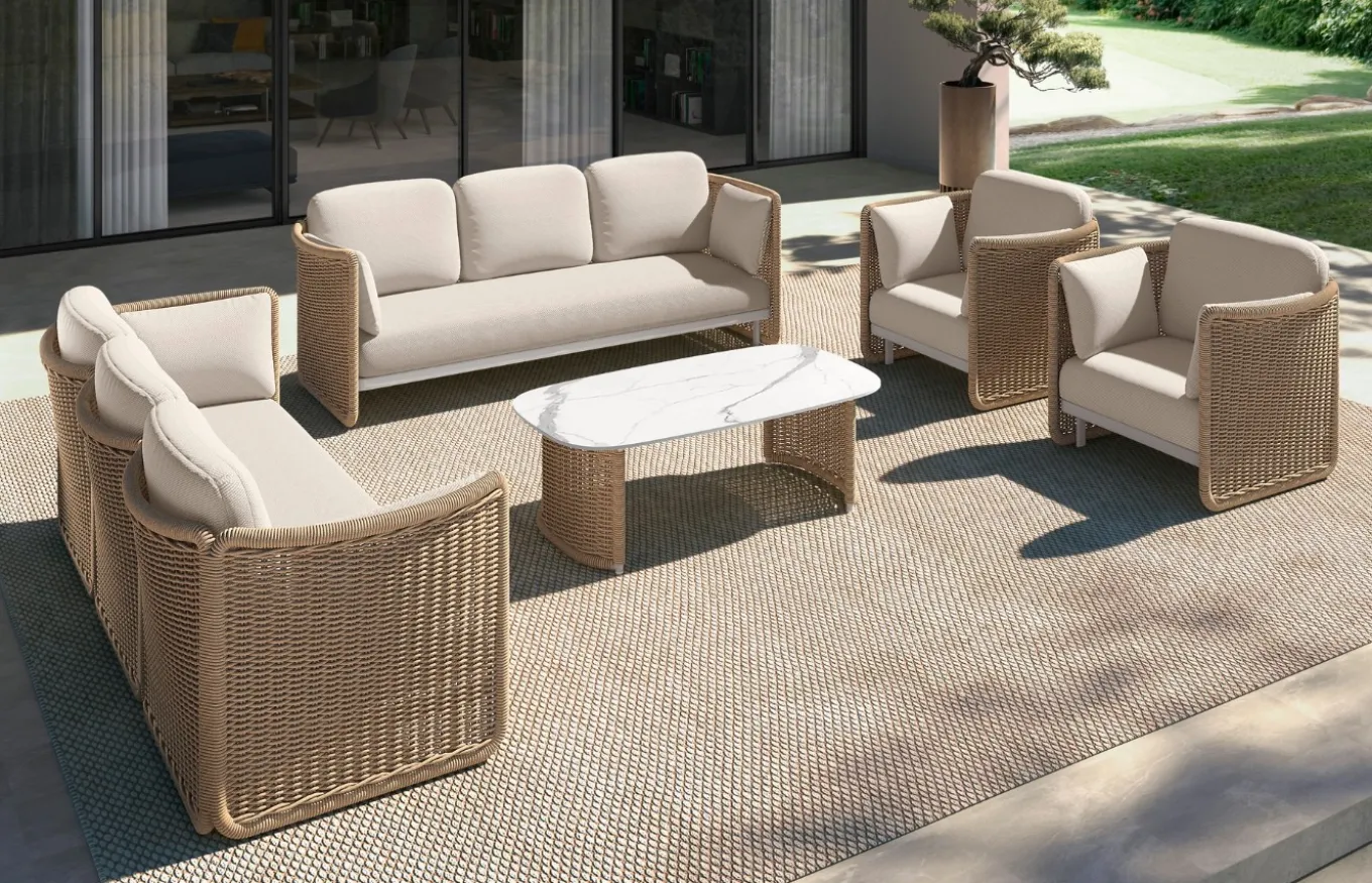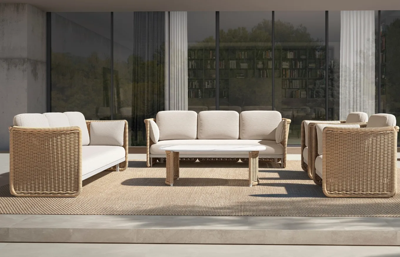 Tiene una estructura interna de aluminio color ivory que le aporta resistencia, mientras que en la parte externa tiene mimbre trenzado de color natural. También cuenta con amplios cojines de asiento y respaldo, disponibles en una gran variedad de tapizados para adaptarse a cualquier espacio.