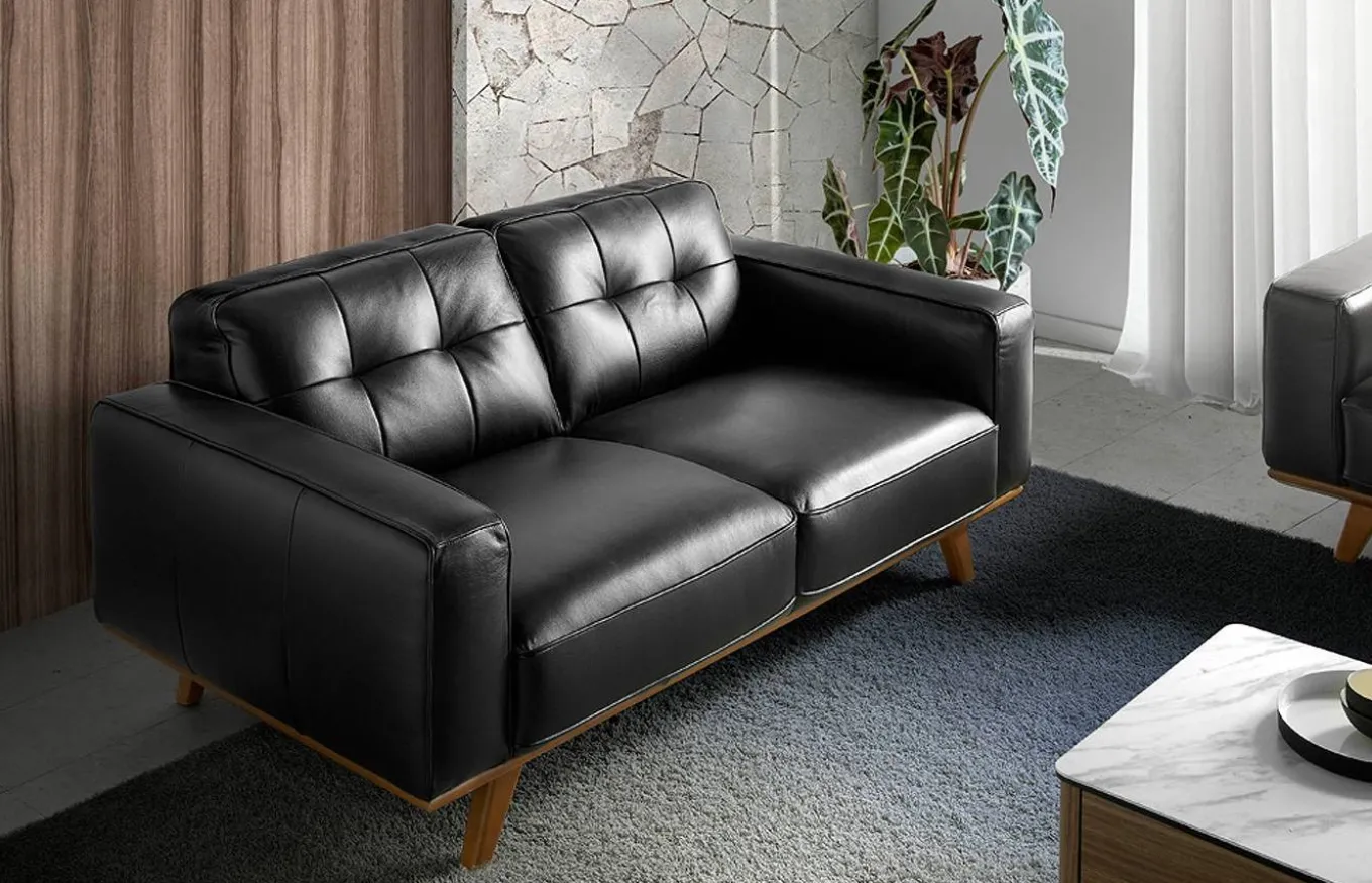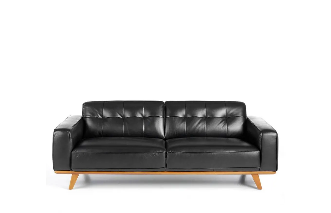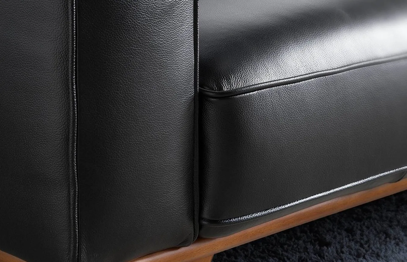 Sofá muy identificativo y con gran personalidad, que combina perfectamente los estilos moderno y vintage. Tapizado en piel de color negro, con patas de madera color nogal.