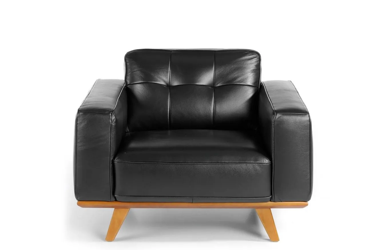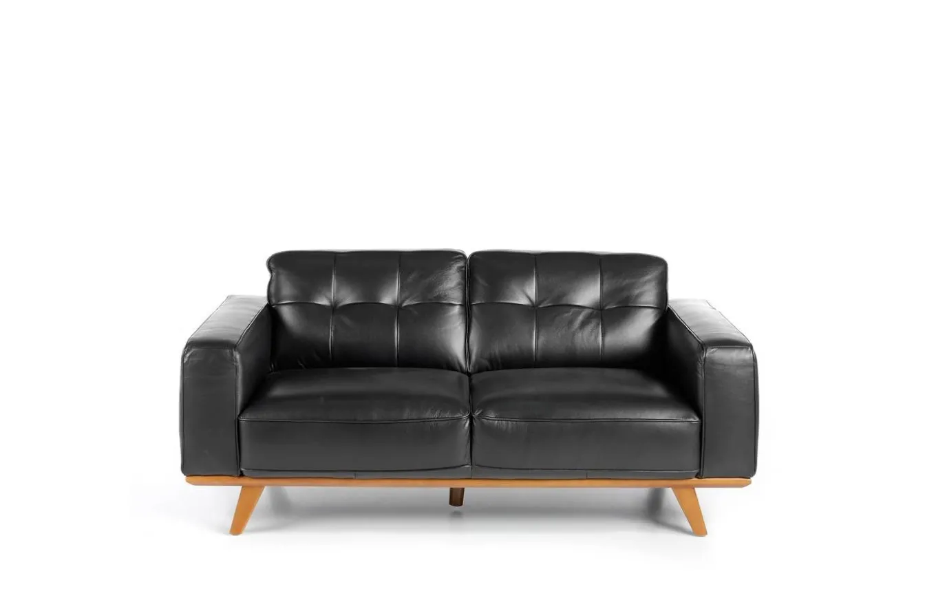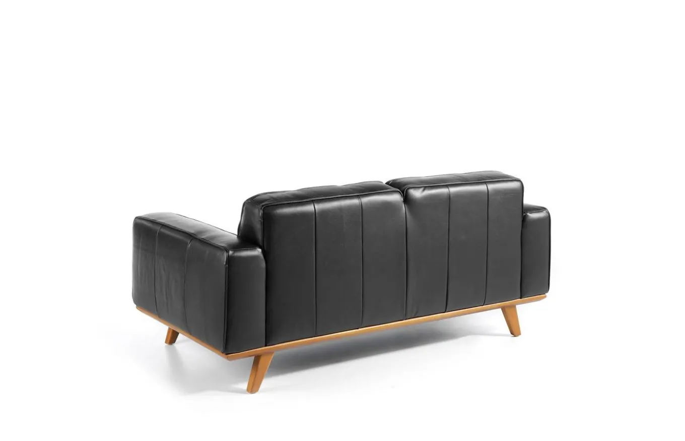 Sofá muy identificativo y con gran personalidad, que combina perfectamente los estilos moderno y vintage. Tapizado en piel de color negro, con patas de madera color nogal.