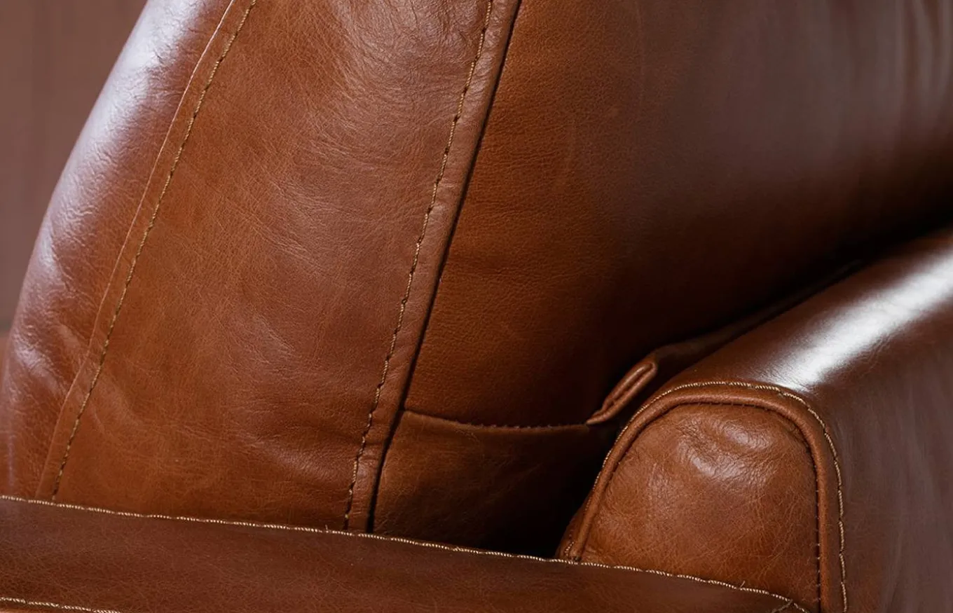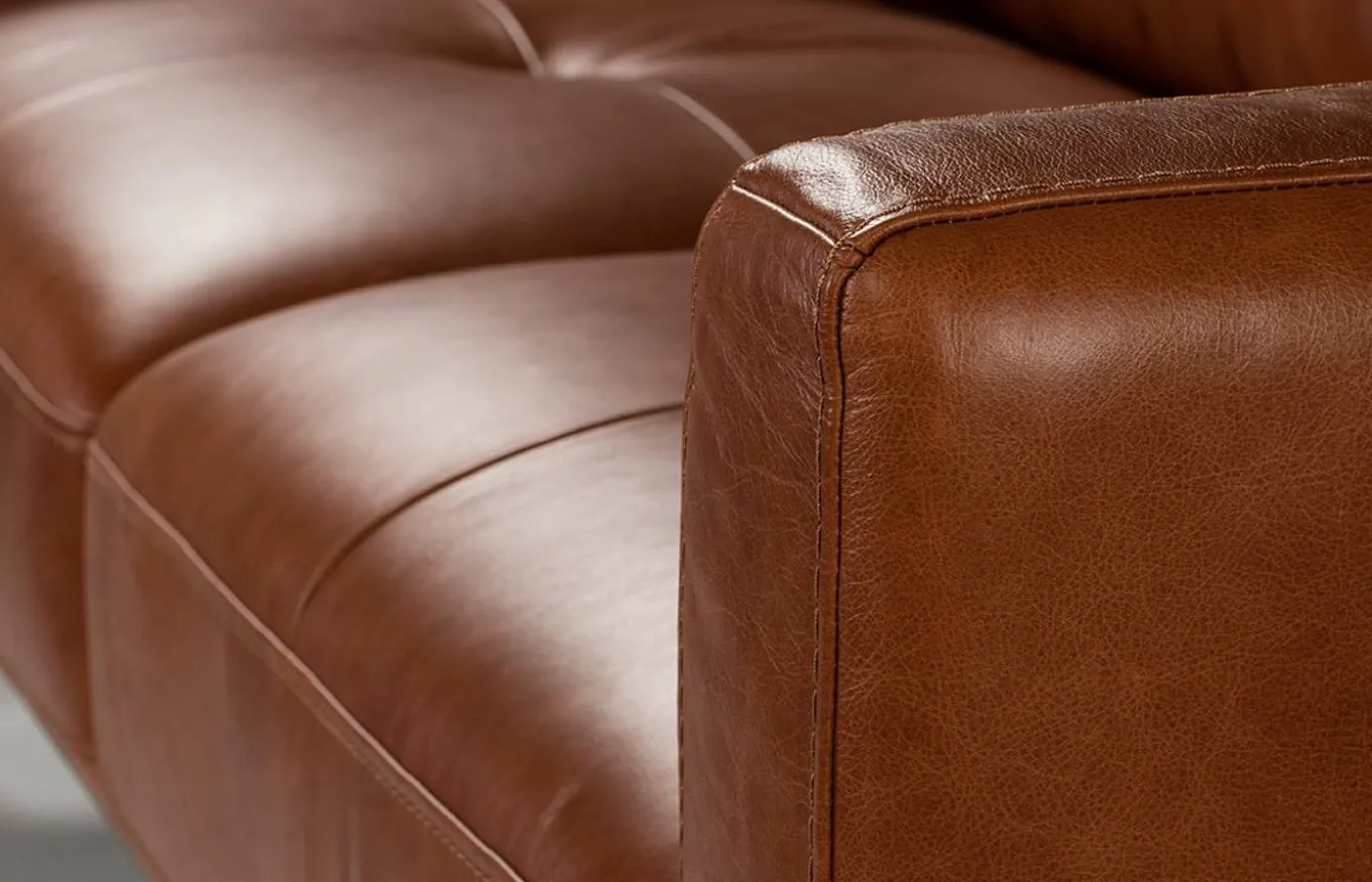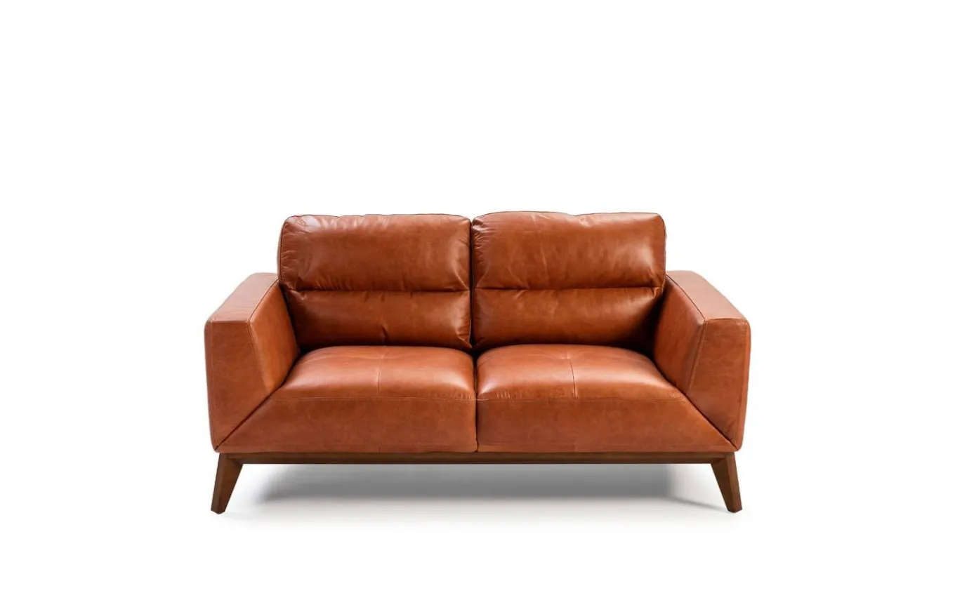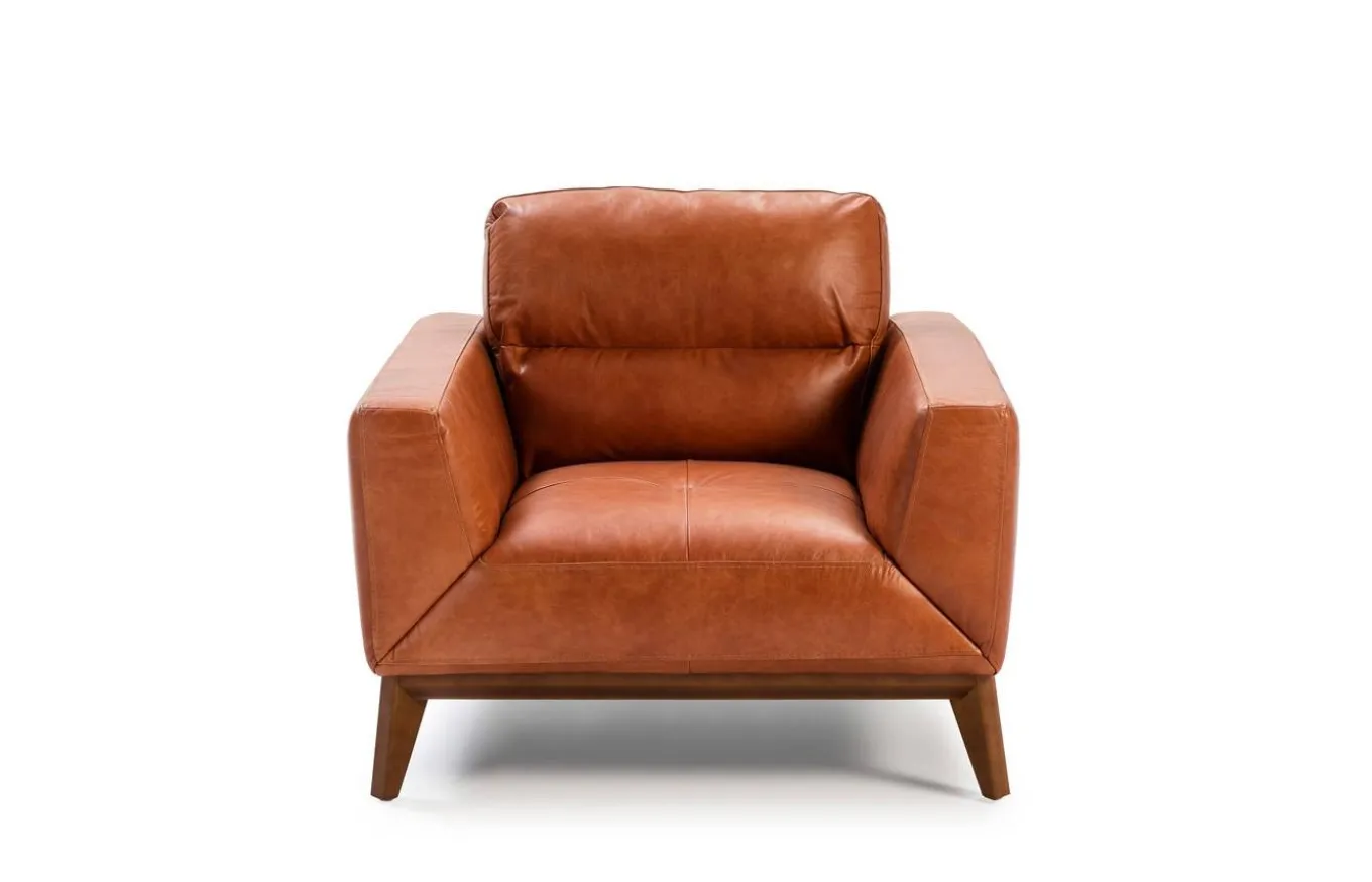 - Tapizado en piel de origen vacuno de 1.5 mm de espesor, con patas de madera color nogal.