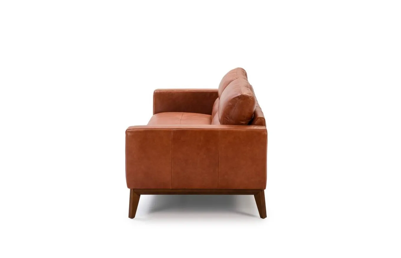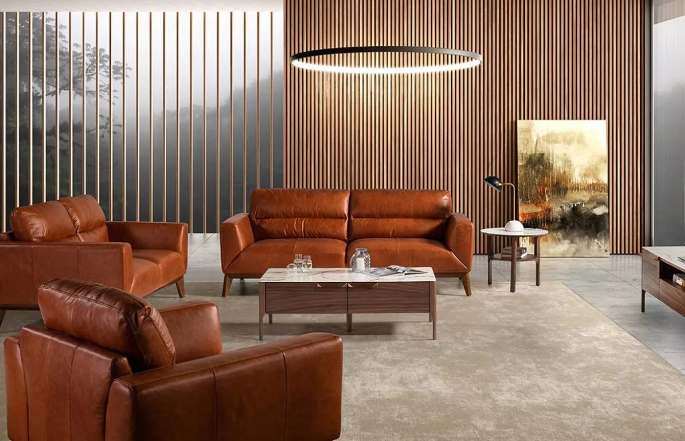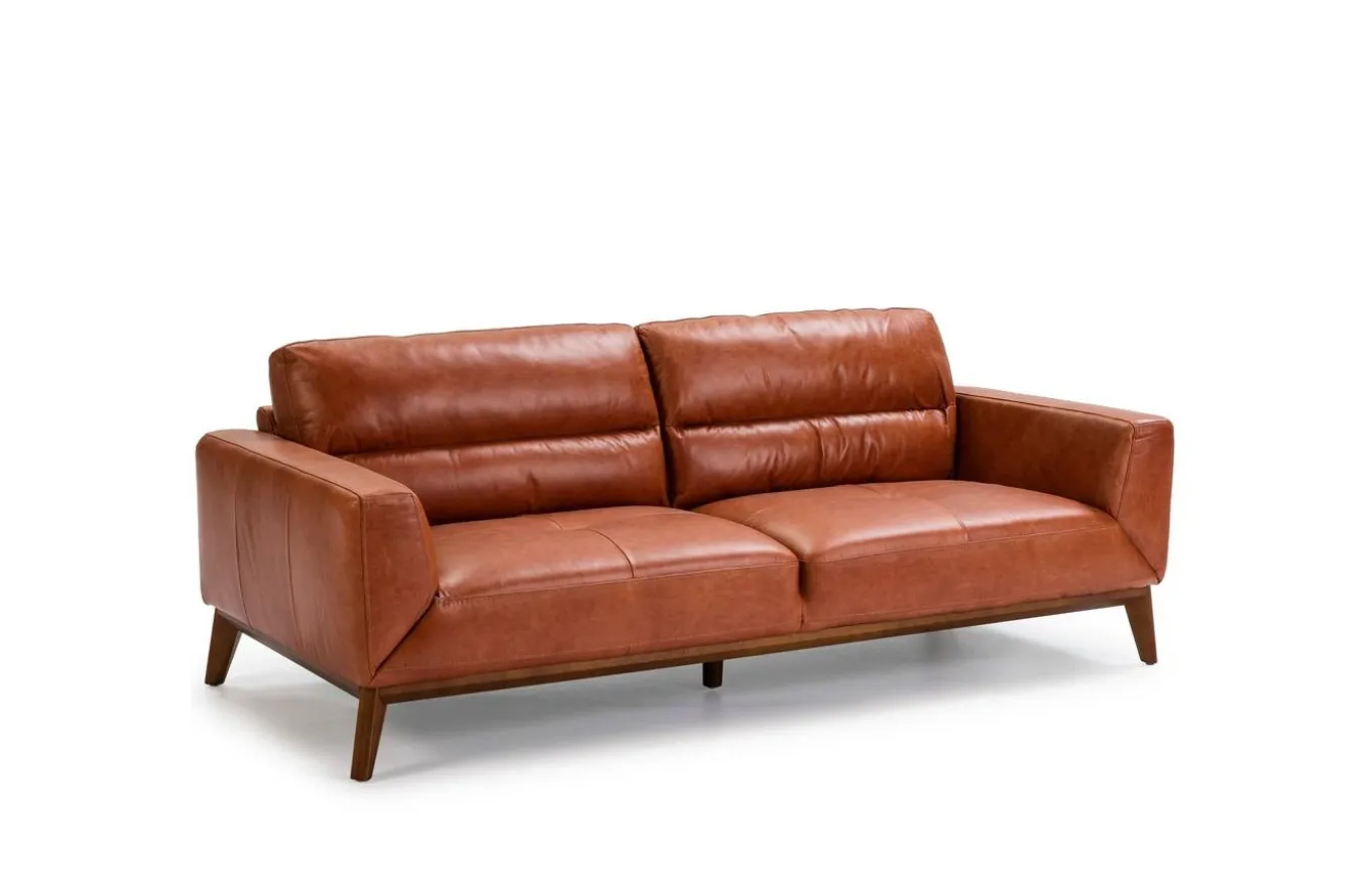 Sofá con un diseño muy personal, que combina el estilo moderno con un marcado aire vintage. Tapizado en piel de origen vacuno, con patas de madera color nogal.