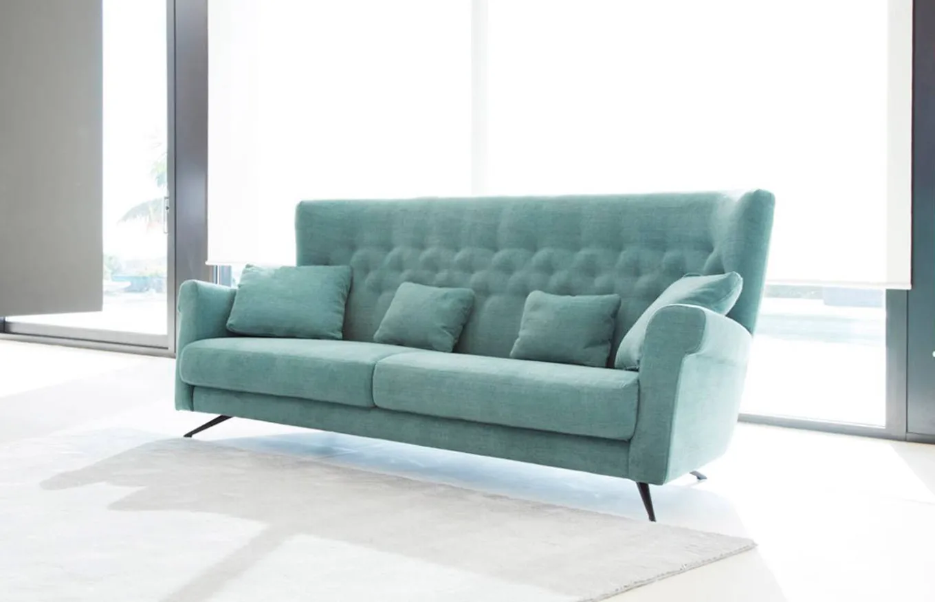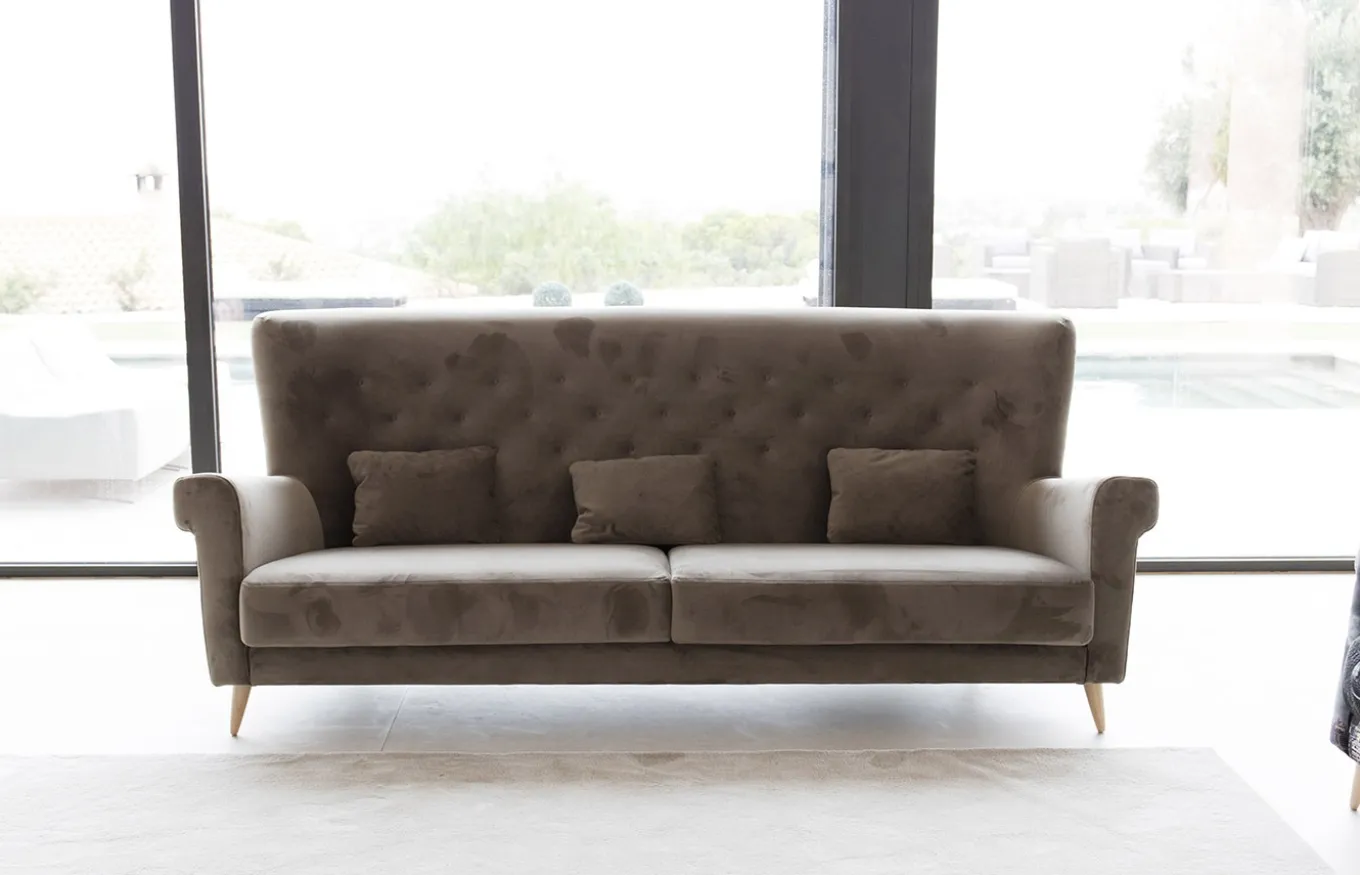 El sofá Nina es una pieza espectacular inspirada en los clásicos sofás de rombos de los años 70. Tiene un diseño de respaldo alto y sentada recta extra cómoda con unos brazos redondeados que le dan el toque tradicional. Las patas son de madera estilo nórdico.