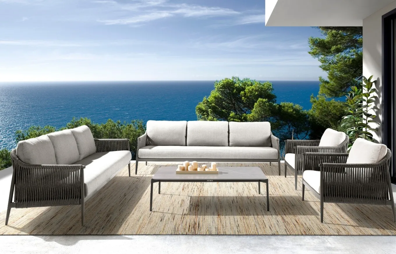 El sofá Termoli de Agua de Mar es una pieza de mobiliario elegante, ideal para espacios exteriores. Está fabricado con una estructura de aluminio resistente en color carbón que se complementa a la perfección con la cuerda redonda del mismo color, formando los brazos y el respaldo.