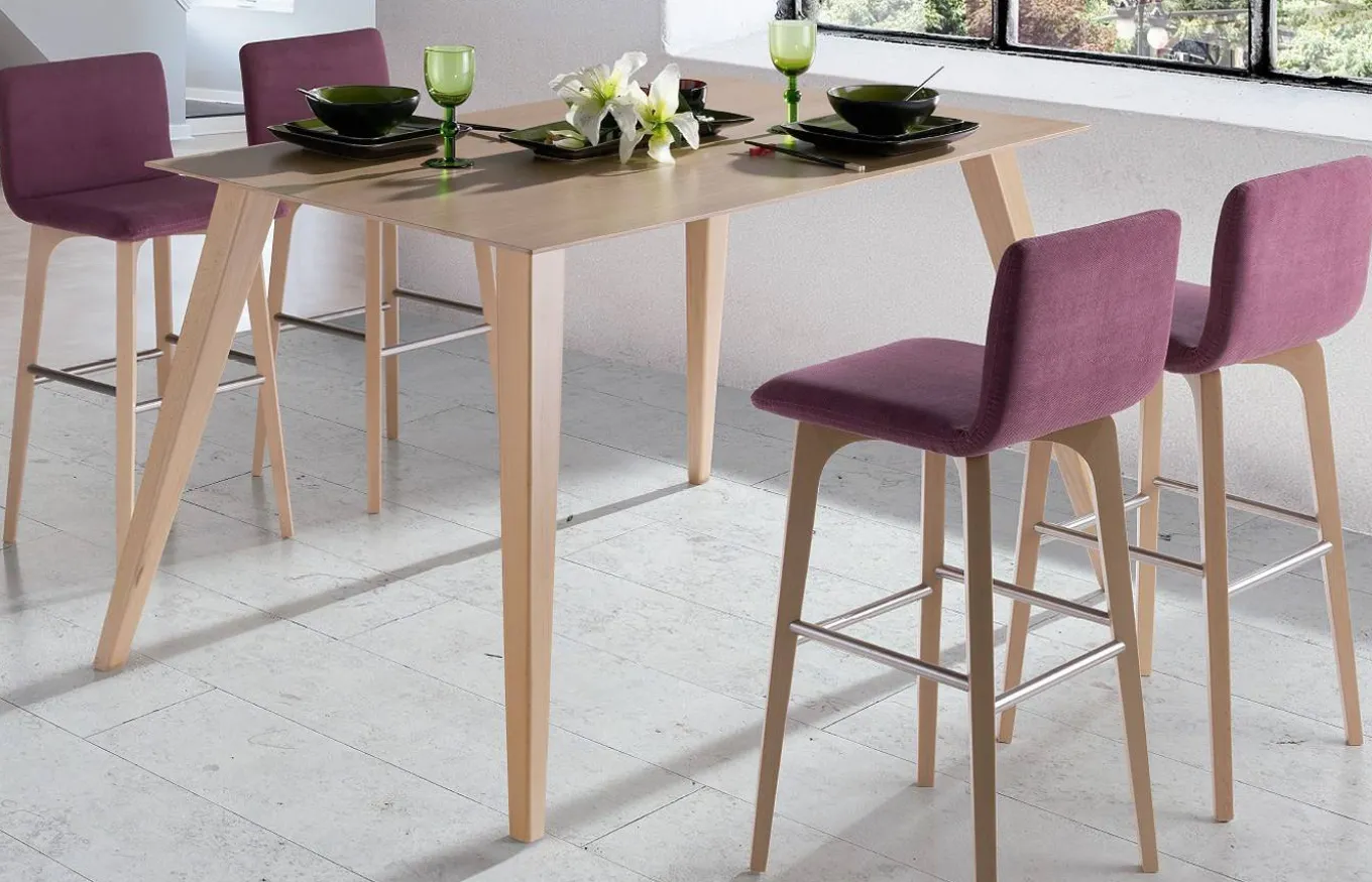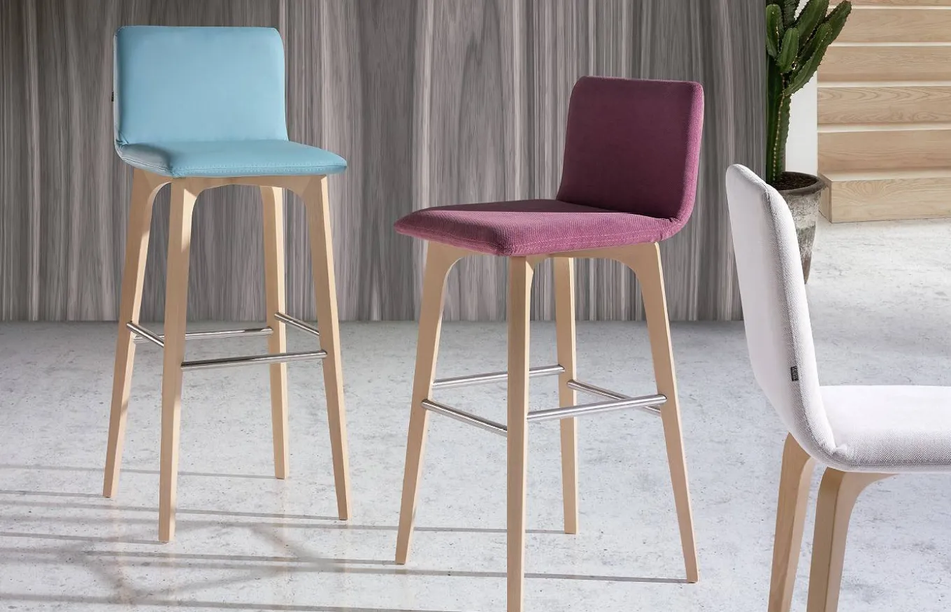 Taburete de estilo nórdico, con asiento y respaldo de una sola pieza, con posibilidad de ser tapizado en múltiples opciones de color según muestrario adjunto.
