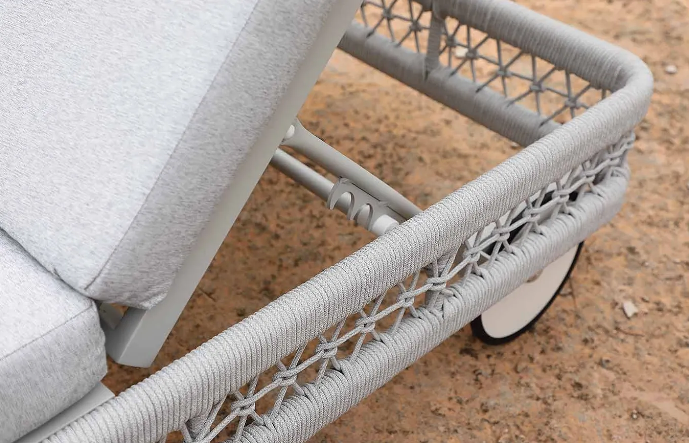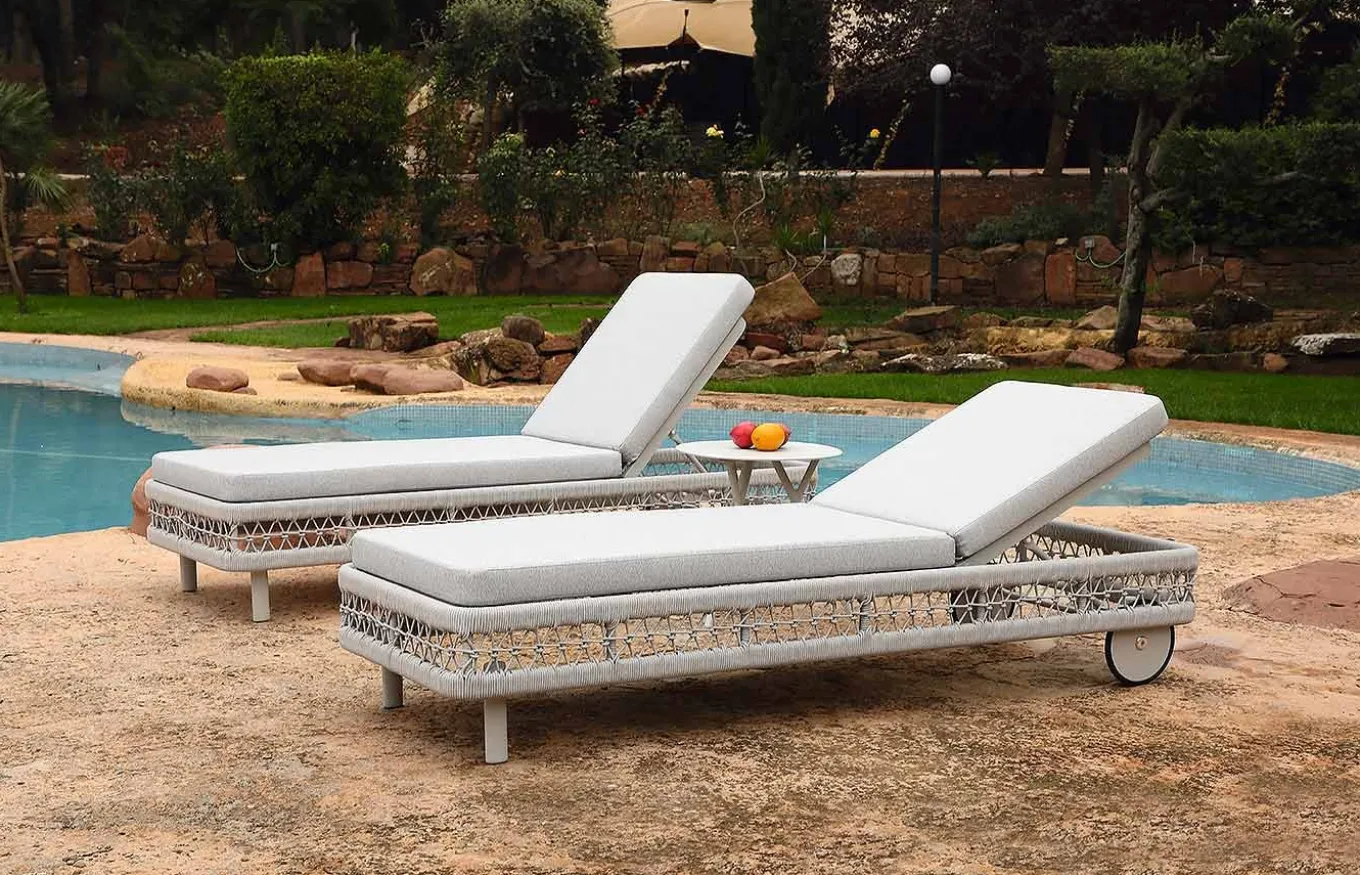 Tumbona de exterior Verona de estilo colonial. Su estructura combina aluminio y cuerda de poliéster para lograr la resistencia y funcionalidad necesaria en un mueble de uso exterior.