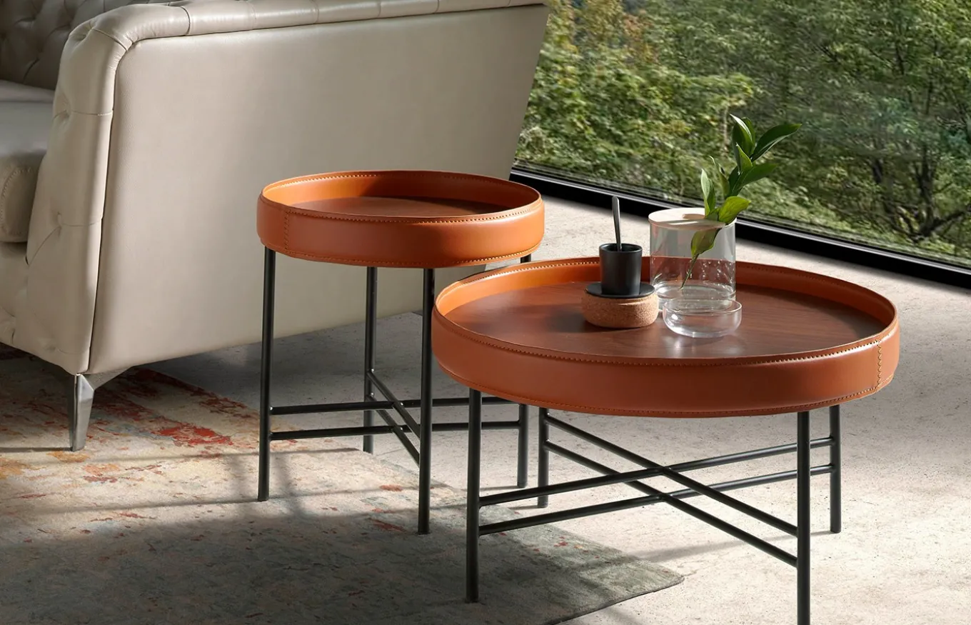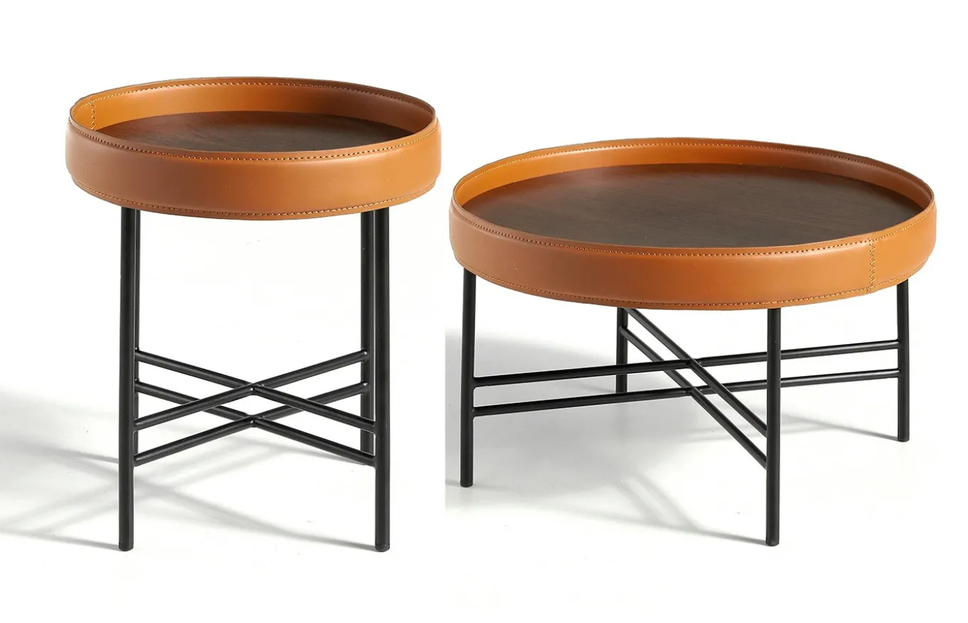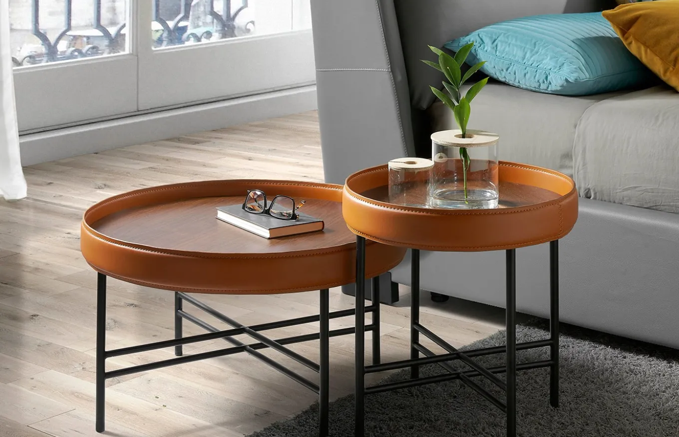 Mesas centro redondas de diseño moderno con tapa de madera chapada en nogal natural de 0,5 mm de espesor y un elegante aro circular tapizado en piel de vacuno reciclado en color coñac, que aporta un toque original y distintivo. Su estructura de patas en acero pintado en epoxi color negro la hace una mesa centro perfecta para crear un look sofisticado, a la vez que original, en tu salón.