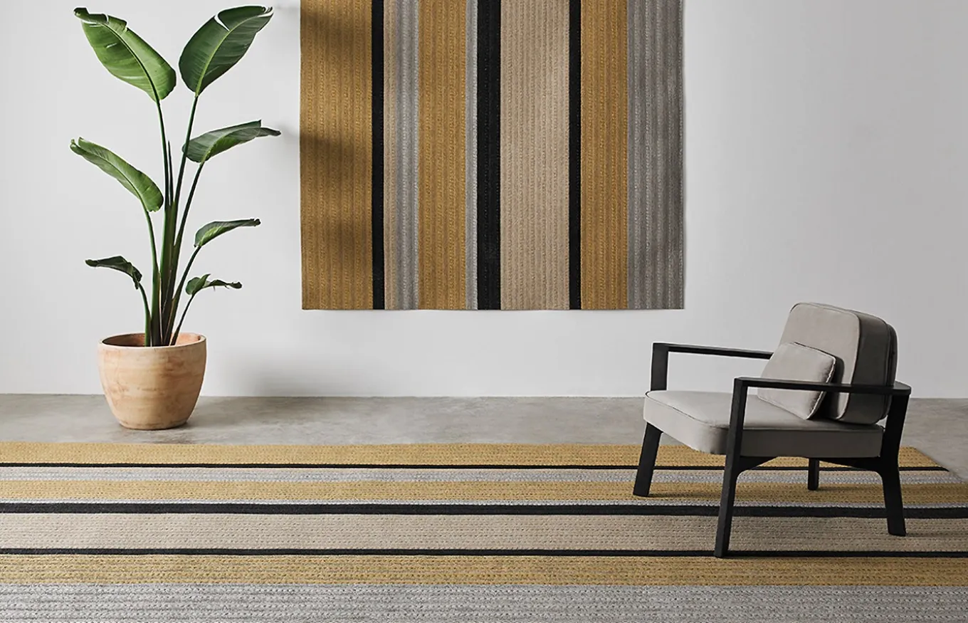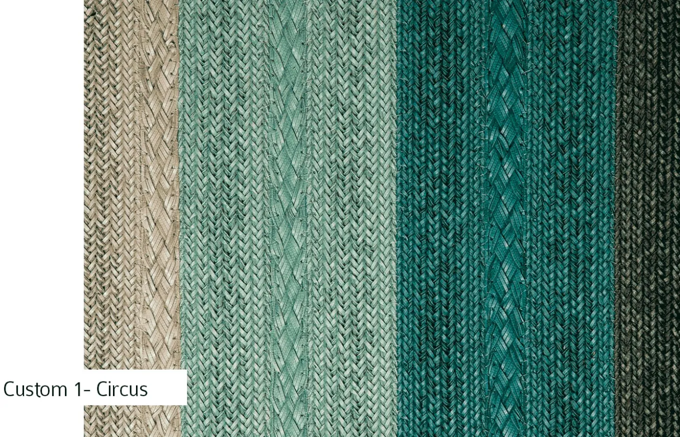 La alfombra Circus es 100% personalizable. Puede elegir entre dos tamaños diferentes de trenzas y una gran selección de colores. Las diferentes combinaciones y las repeticiones de trenzas formarán diferentes alfombras de líneas, rayas y bloques de colores.
