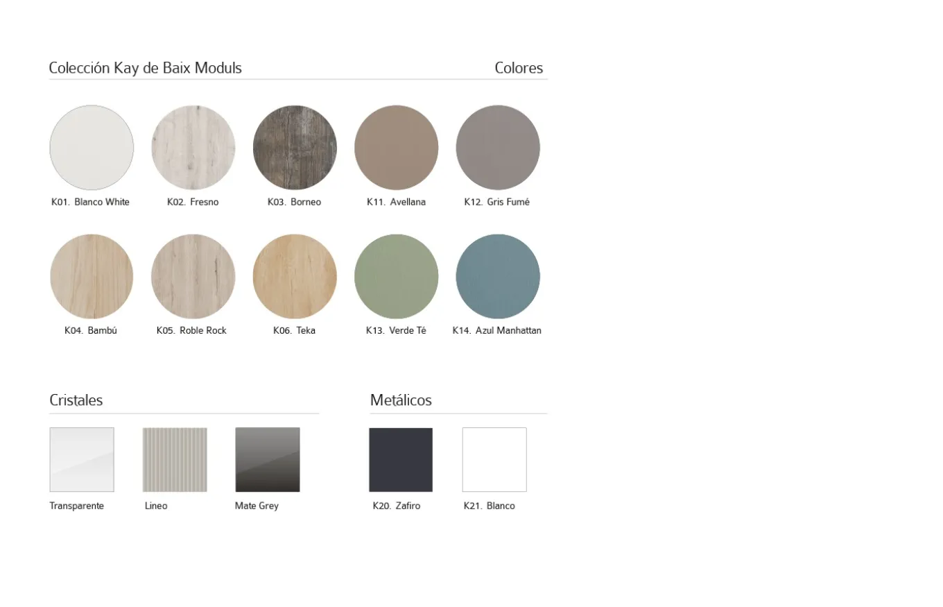 Ofrecemos una amplia variedad de acabados para que puedas personalizar el mueble y lograr que se adapte perfectamente a tu espacio. Los acabados de la imagen adjunta son: