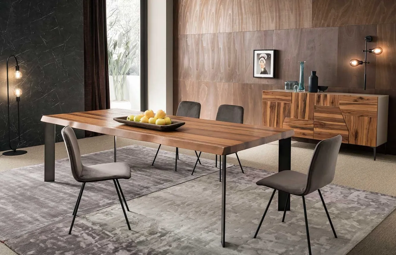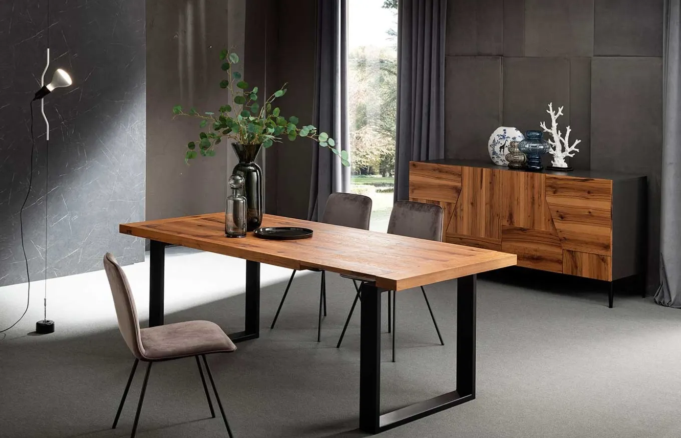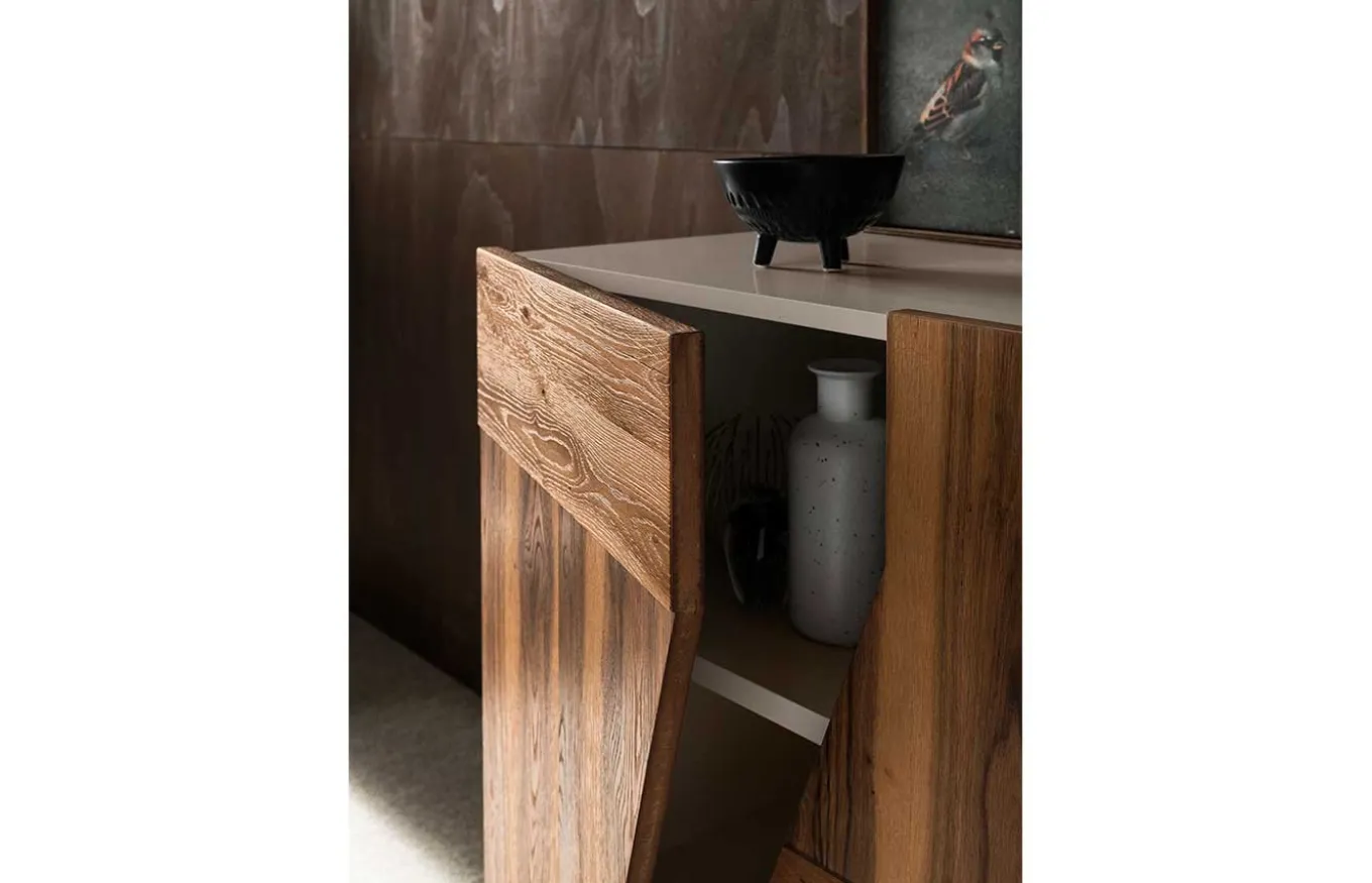 Aparador Daisy. El diseño de Rivanova es muy funcional, fácil de interpretar, pero al mismo tiempo rico en detalles dados por los materiales utilizados: madera natural, cristal y hierro. Rivanova selecciona la madera por su singularidad, realzada por imperfecciones naturales que son consideradas parte integrante del resultado final que se quiere conseguir.