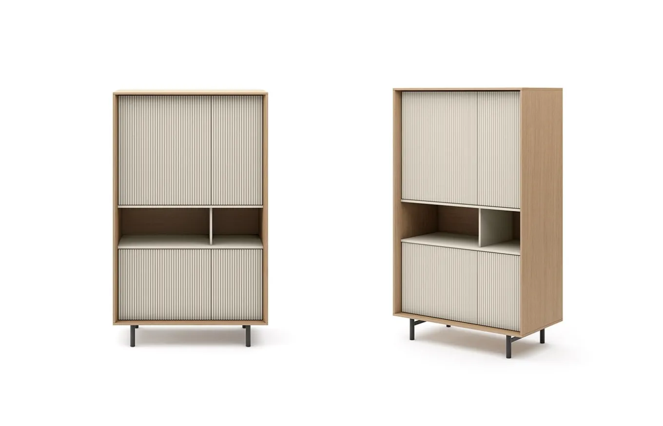 El aparador Ideas 701 destaca por sus frentes con efecto alistonado. La combinación de materiales, como es la chapa de madera natural y el lacado, recrean un ambiente acogedor y cálido. El aparador Ideas 701 está compuesto por cuatro puertas batientes y dos huecos para almacenaje.