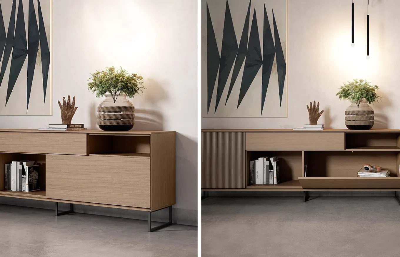 - Aparador compuesto por una puerta batiente con efecto acanalado, una puerta abatible y un cajón extraíble.