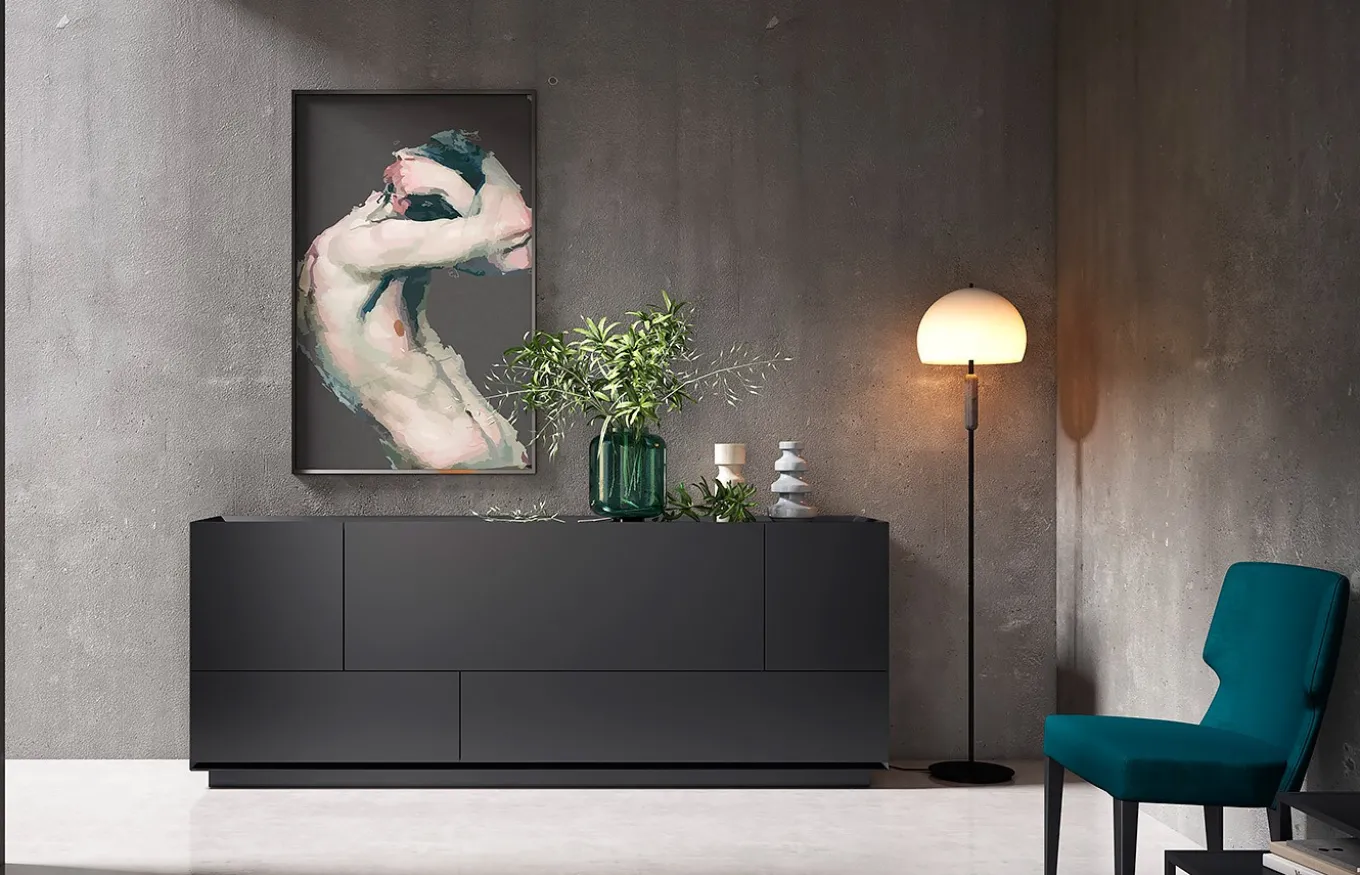 - Aparador compuesto por una puerta batiente de gran dimensión, dos puertas laterales y dos cajones extraíbles.