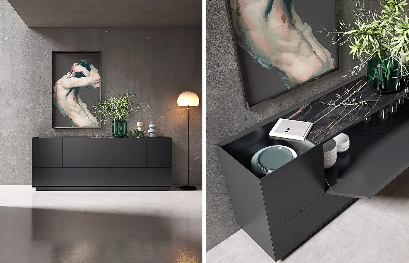 El aparador Ideas 735 destaca por el contraste de acabados en lacado, cerámica y cristal. El aparador Ideas combina a la perfección con cualquier estilo de decoración en el recibidor o en el salón.