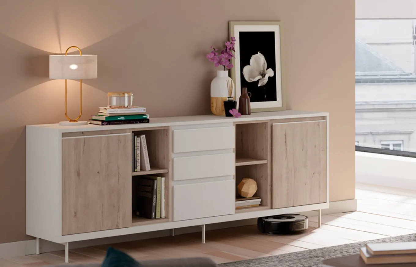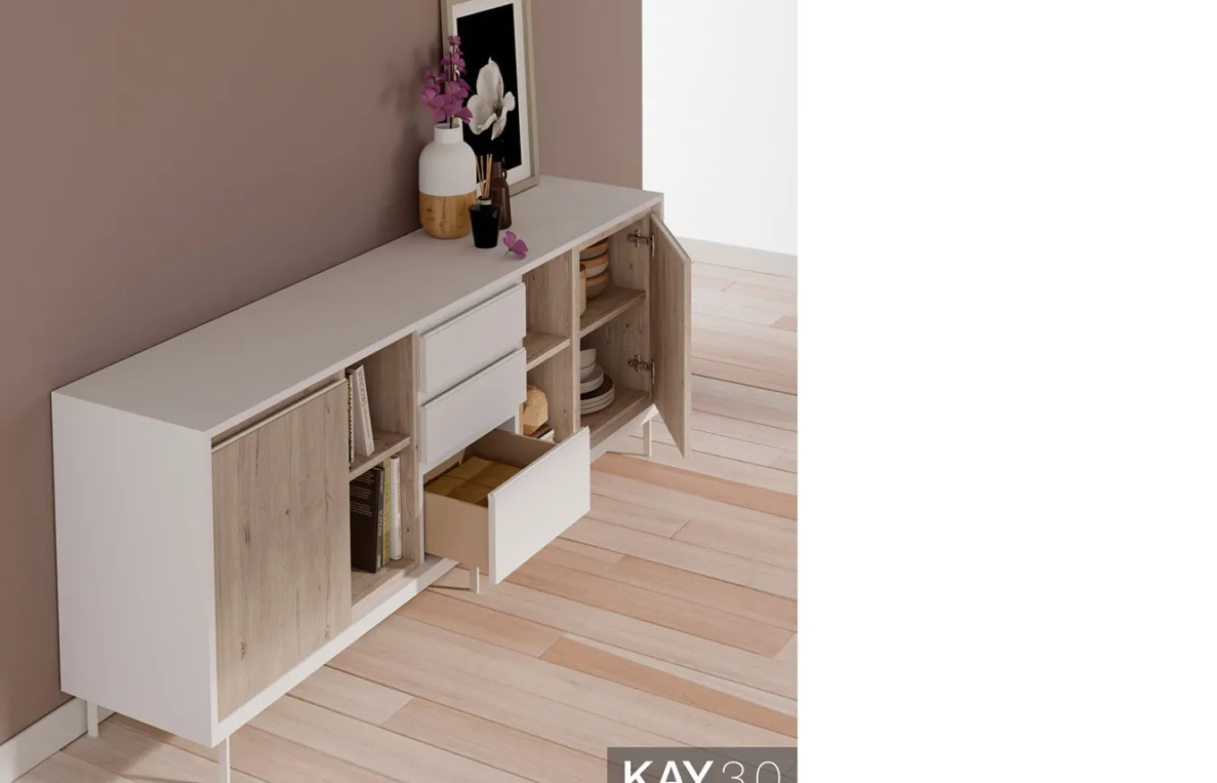 El aparador K13 destaca por su gran espacio de almacenaje, cuenta con huecos decorativos que puedes utilizar como librería, en los que puedes elegir en un color diferente. Con la nueva colección Kay 3.0 podrás diseñar, de manera fácil y adaptable, tu salón combinando diferentes módulos, medidas y acabados consiguiendo un espacio versátil, natural y elegante.