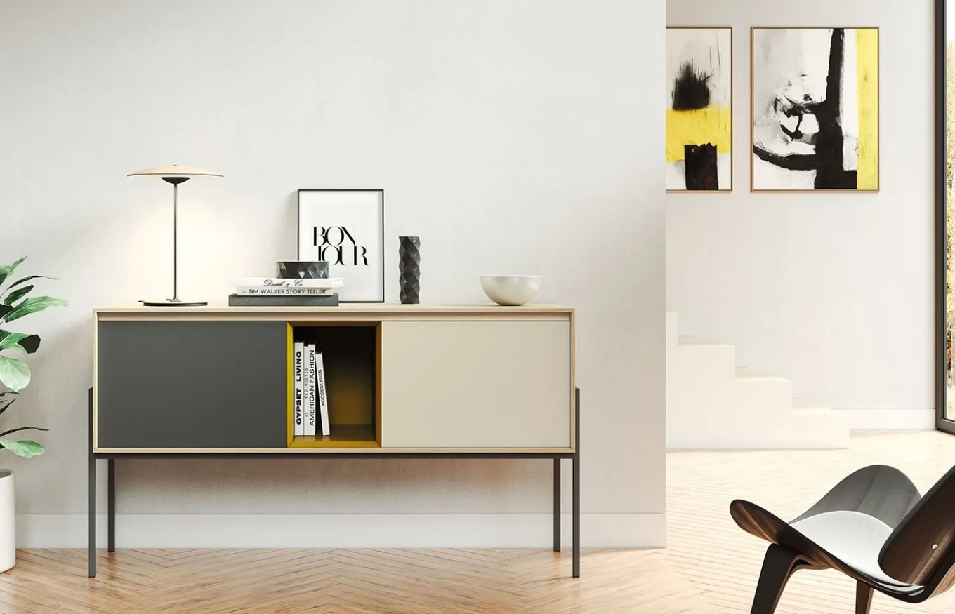 Aparador de estilo moderno. La colección Kross se desarrolla en torno a una gran variedad de módulos con distintas medidas, puertas batientes, abatibles, cajones y una multitud de opciones con diversidad de materiales y acabados. Una manera diferente de entender el mueble, pensado no solo para ordenar, sino para el placer de crear y diseñar tu propio mueble.