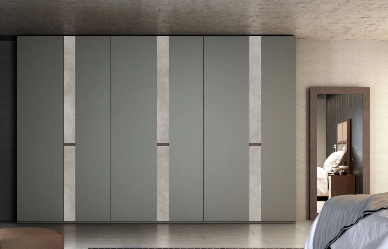 Armario de 6 puertas batientes modelo Eme con detalles en porcelánico combinadas con puertas modelo Lisa. Materiales equidistantes aplacando diferentes texturas y colores para formar líneas que aportan verticalidad y equilibrio.
