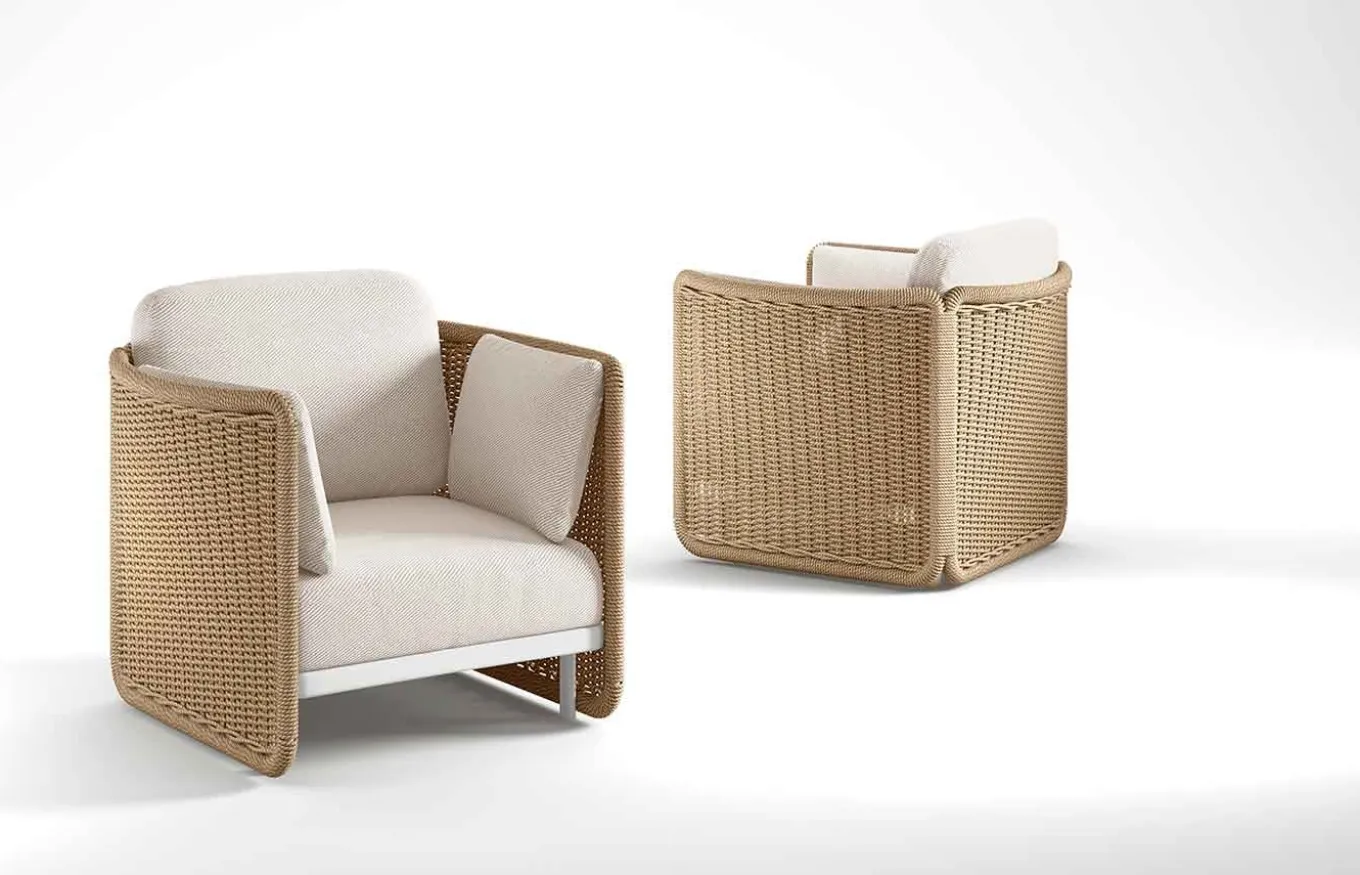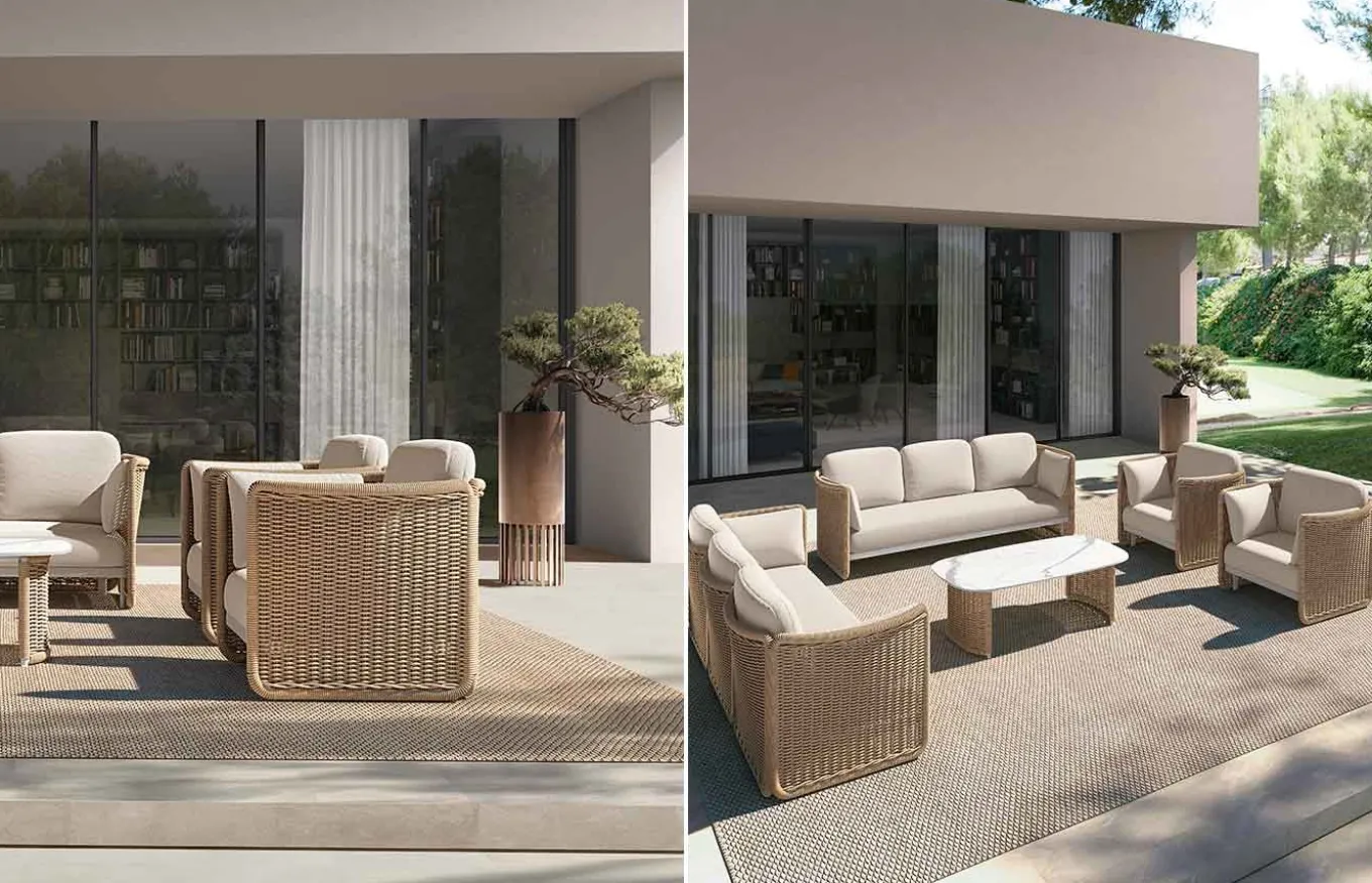 La colección de exterior Catalina de Agua de Mar destaca por su diseño elegante y materiales de alta calidad, siendo ideal para terrazas y jardines. Esta línea incluye piezas como sofás, sillones y mesas de centro, todas fabricadas con una estructura interna de aluminio lacado en color marfil y revestidas con mimbre trenzado.