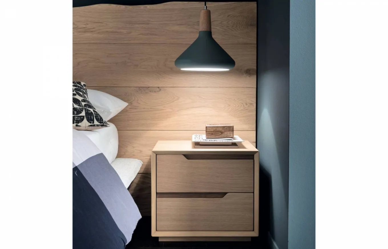 La cama modelo Wood de AltaCorte destaca sin duda por su singular cabecero, que sigue la línea del tablero wood pero adaptando su diseño para el dormitorio. La calidez de la madera maciza se combina con una base tapizada creando una combinación de texturas de lo más interesante en la que el borde irregular, que corresponde al borde del tronco, es el protagonista.