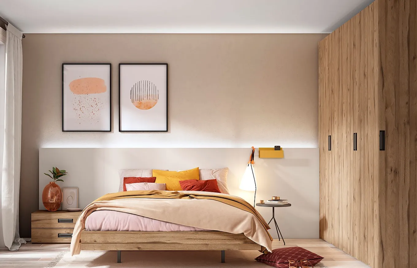 Aveces la elegancia reside en la sencillez, así es como se ha diseñado la composición de dormitorio y juvenil 24. El cabecero de tonalidad clara y con luz led incorporada hace que la habitación adquiera una mayor amplitud visual. En contraste con el cabecero, destacan sus dos mesillas y la base de para la cama en colores Onix y Canela.