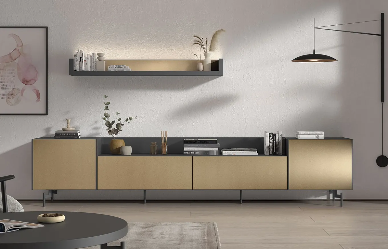 Composición de salón perteneciente a la colección Royal que ofrece un amplio programa para mobiliario de salón impregnado de diseño contemporáneo que se viste de tantas opciones, nuevos materiales y modulación que da como resultado un mobiliario totalmente renovado con últimas tendencias en diseño y arquitectura.