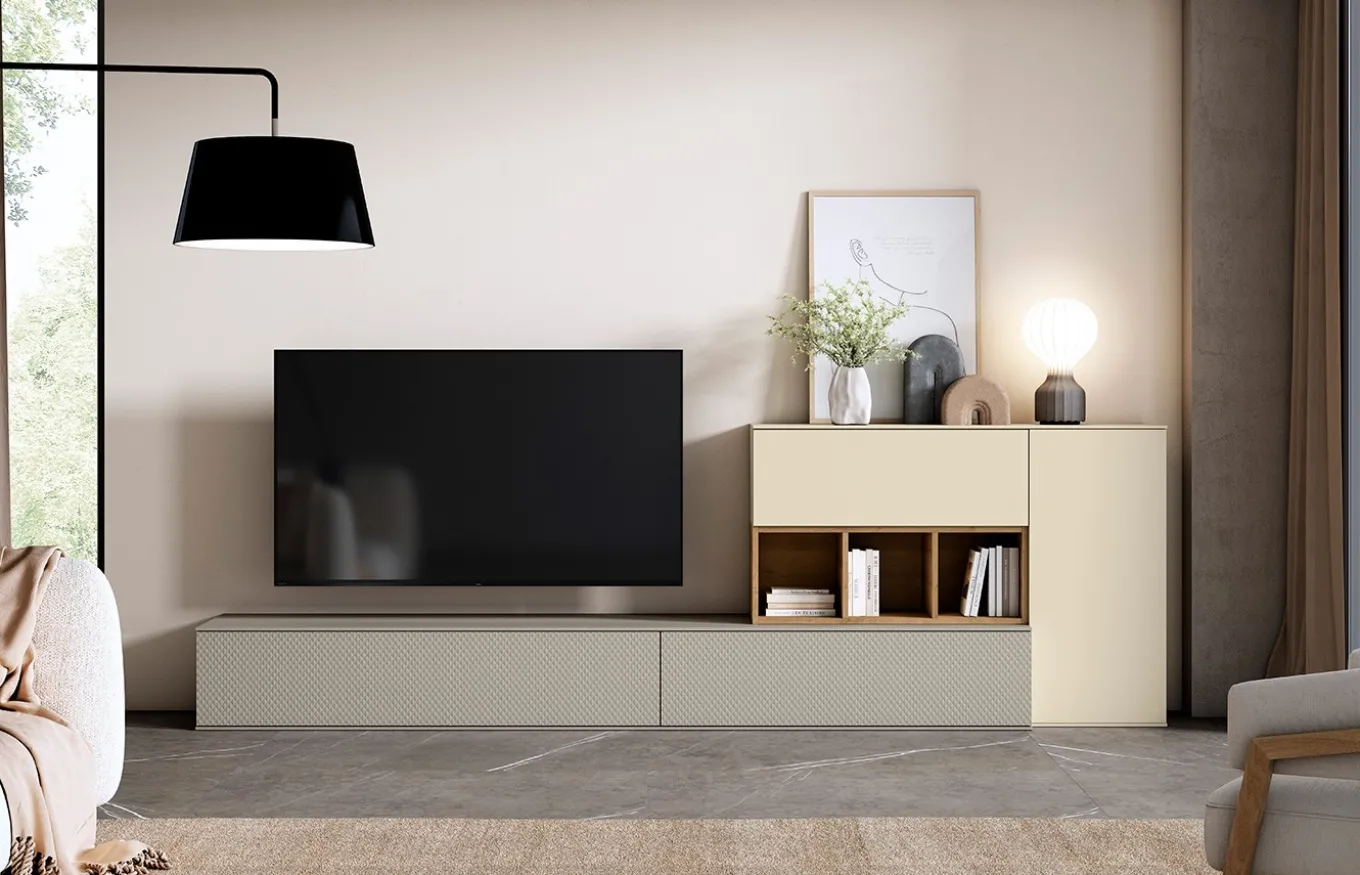 La composición de salón Individual 03 de Lan Mobel se distingue por incorporar el exclusivo frente QBIC, un diseño sofisticado y geométrico que se ofrece siempre en acabado lacado para resaltar su relieve. Esta composición cuenta con dos módulos bajos con puertas abatibles y frentes QBIC, revestidos por una fina tapa de 1 cm de grosor que aporta ligereza visual. A la derecha, se integra un módulo vertical con puerta abatible que oculta en su interior estantes funcionales, ideales para almacenamiento.