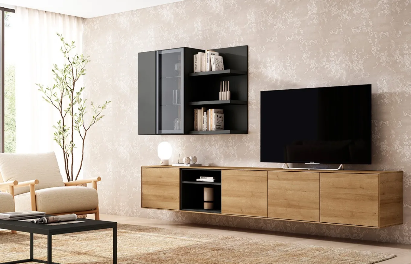 La composición de salón 06 Individual de Lan Mobel ofrece una solución ligera y funcional, ideal para espacios modernos. El conjunto se compone de un mueble de televisión colgado con cuatro puertas batientes que ocultan un estante interior continuo, proporcionando un amplio espacio de almacenamiento sin ocupar superficie de suelo. Se incluye una estantería colgada formada por dos módulos de distintas anchuras (30 cm y 45 cm) que combinan puerta de madera y vitrina, aportando dinamismo visual y la posibilidad de exhibir o guardar objetos con elegancia.