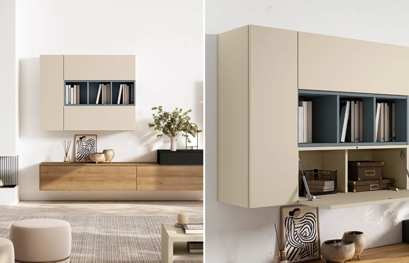 La composición de salón Individual 08 de Lan Mobel es un elegante mueble TV colgado que combina dos módulos de 242 cm superpuestos: uno con puertas abatibles y otro con cajones, ambos revestidos en el exclusivo LOOK TOTAL THIN, un revestimiento de 1 cm que aporta ligereza visual y un diseño moderno. Completando el conjunto, incluye una estantería colgada con tres puertas y huecos abiertos ideales para decoración.