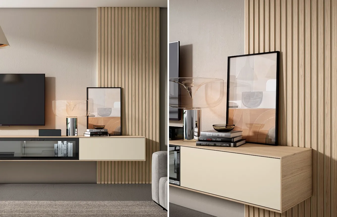 Esta composición de salón de la colección Individual de Lan Mobel apuesta por un diseño moderno y sofisticado, cuenta por un mueble TV colgado que combina funcionalidad y estilo. Incorpora una puerta abatible, una vitrina con cristal, y dos cajones, ofreciendo un almacenamiento versátil y ordenado.