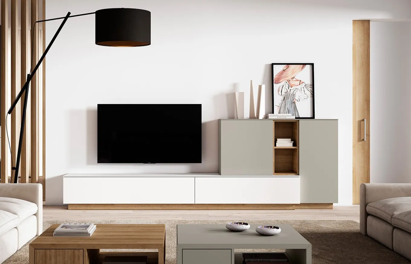 La composición de salón 32 del catálogo Individual de Lan Mobel se caracteriza por un diseño minimalista y elegante formado por un módulo bajo con dos puertas abatibles cubiertas por una tapa superior de 1 cm de grosor, acompañado de un módulo estantería de fondo reducido que incluye dos puertas y dos huecos, también rematado con una tapa de 1 cm. Todo el conjunto descansa sobre un zócalo de 7 cm de altura, creando un efecto visual ligero y moderno.