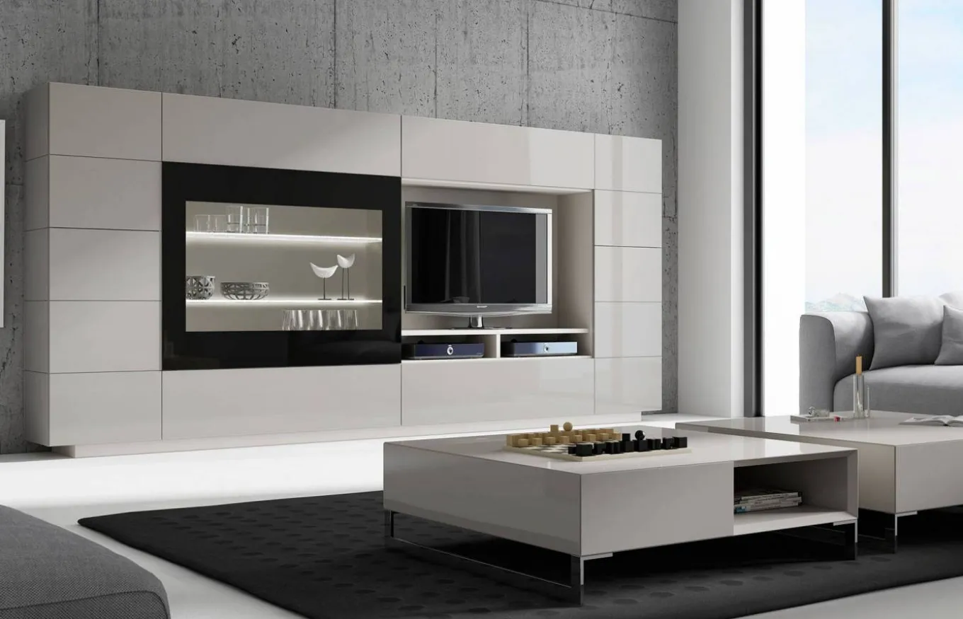Se trata de un mueble compacto que incluye todo lo necesario en una única pieza, hueco para la televisón, para los aparatos multimedia, una vitrina con puerta corredera, etc, con un diseño exquisito en el que predomina la sobriedad de las líneas rectas.