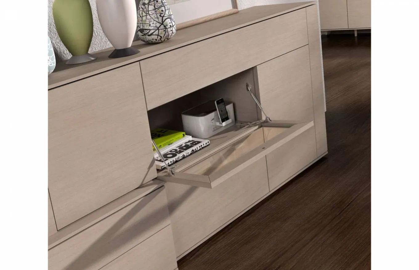 Lleva un aparador superpuesto con un mueble TV que destaca por el juego de profundidades de las dos piezas, creando una combinación única.