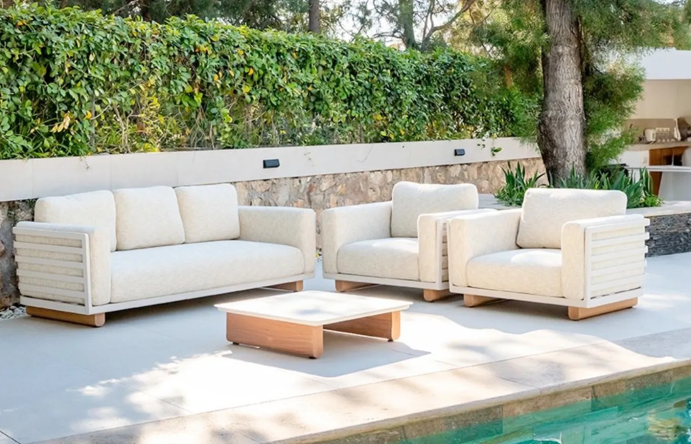 Transforma tu terraza o jardín con el conjunto de exterior Vega de Majestic Garden. Diseñado para proporcionar un ambiente acogedor y funcional, con una estructura y materiales que garantizan durabilidad, gracias al aluminio que es resistente a la intemperie, y con unos cojines acolchados que ofrecen una experiencia de gran comodidad.