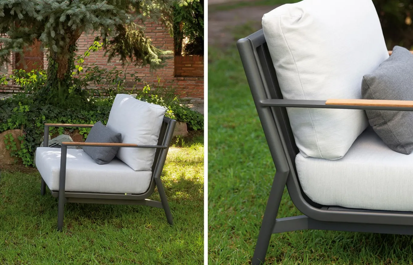 - Estructura de aluminio. El aluminio es un metal no ferroso que combina una alta rigidez mecánica con un peso ligero. Esta característica lo hace especialmente adecuado para la fabricación de mobiliario. El aluminio contiene un tratamiento térmico y posteriormente se le aplica un termolacado con pintura en polvo de alta calidad, altamente resistente al exterior. Limpiar con agua y jabón neutro con un trapo suave.