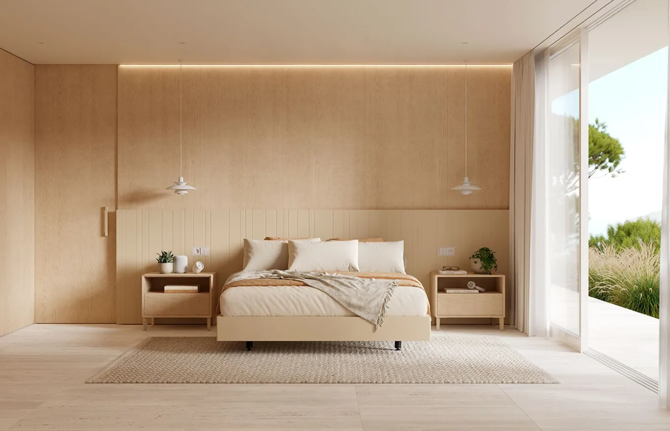 El dormitorio de estilo mediterráneo de Vive combina simplicidad y elegancia natural. Incluye mesitas de madera con un cajón y un hueco para almacenamiento funcional y ligero. El protagonista es el cabezal lacado COMBO CODIC, con líneas verticales que aportan ritmo y carácter al espacio. La base aro flotante, a juego con el cabezal y también lacada, completa el conjunto, ofreciendo un efecto de cama suspendida que aporta ligereza y sofisticación al dormitorio.