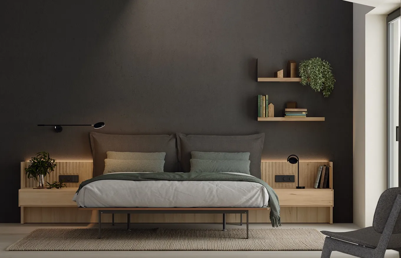 Crea un refugio de ensueño en tu dormitorio con la combinación perfecta de confort y estilo: el cabecero tapizado Cushion y el laminado Limit con luz LED de Lagrama.