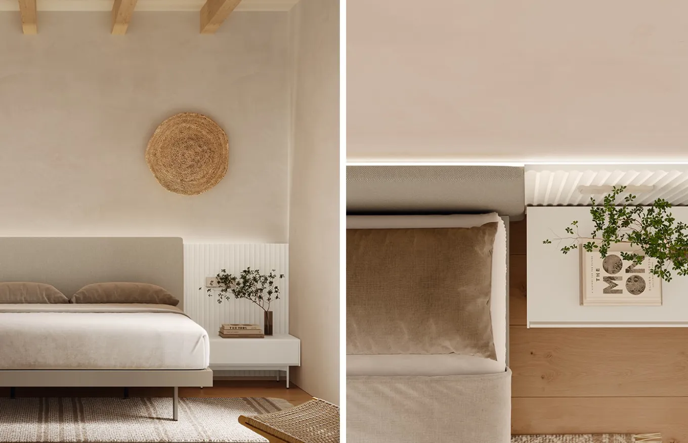 Despierta cada mañana en un ambiente de ensueño gracias a la unión de dos piezas excepcionales de Lagrama: el cabecero tapizado Essencial y el cabecero Ona.