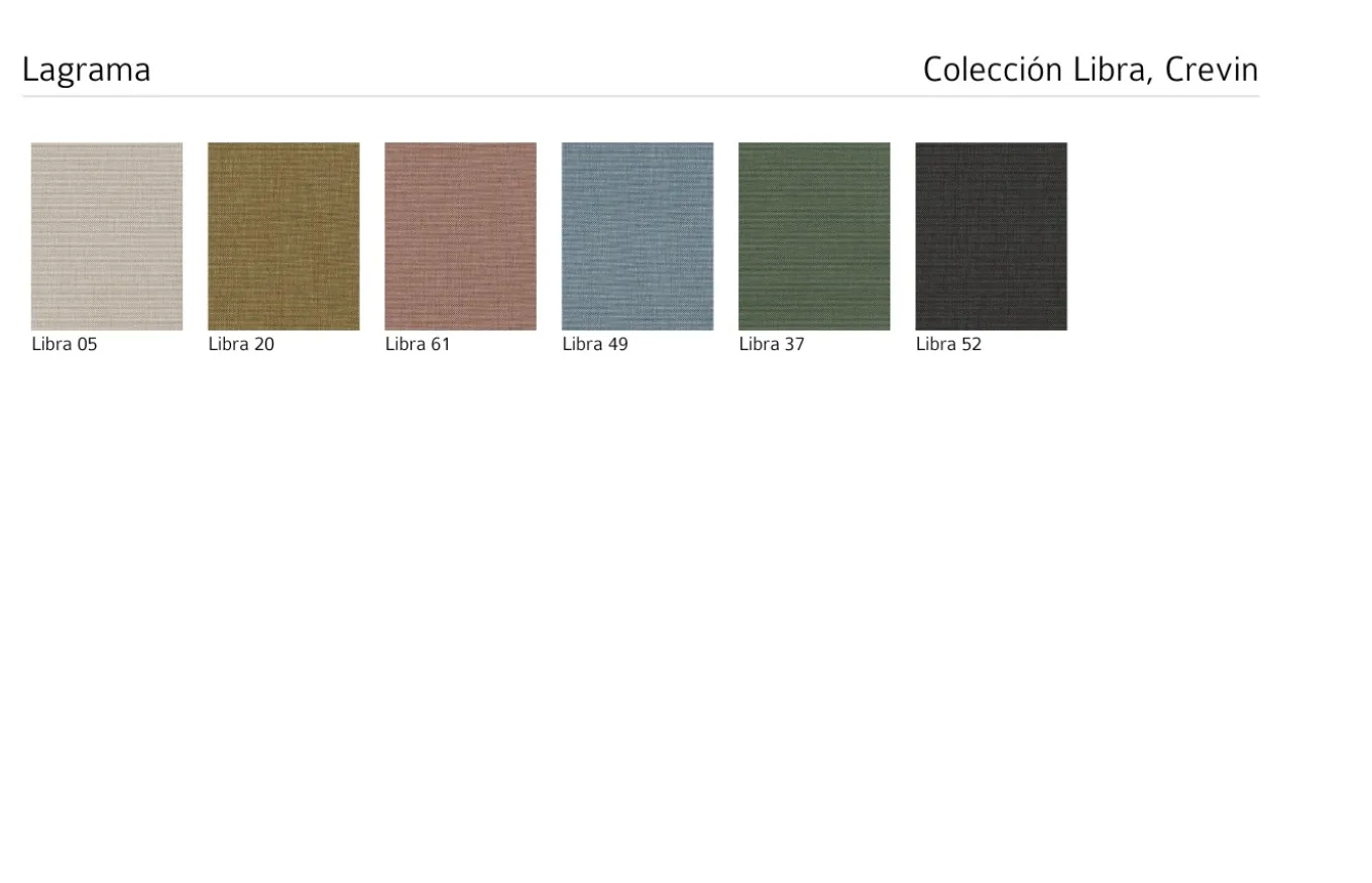 - Tapizado Libra de Crevin, tejido duradero y de fácil limpieza, y puede además limpiarse con una solución de 20% lejía y 80% agua. Ver imagen de acabados.