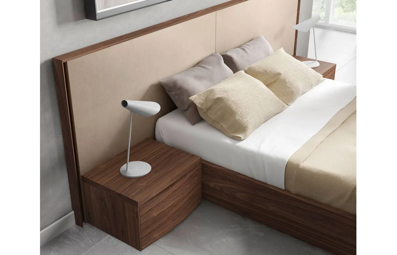 - Cabezero tapizado modelo M22, para colchón de 150 cm, con unas medidas de 291 cm de ancho x 100 cm de alto x 9 cm de grueso, incorpora luz LED. Acabado F06 Nogal y tapizado en polipiel T10 Beige.