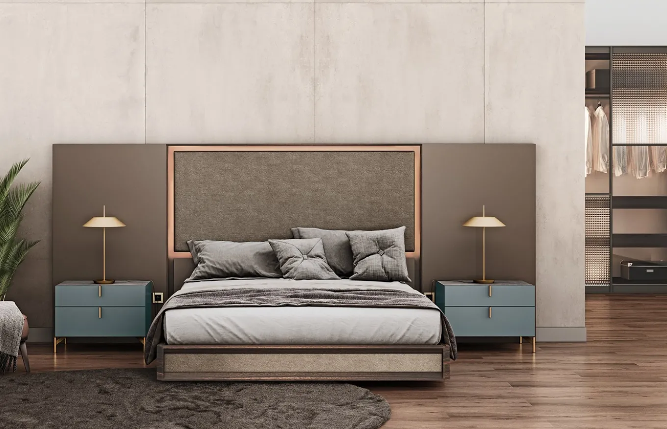 El Dormitorio Light de la colección Bedrooms de Emedé permite la superposición de texturas en todos los materiales disponibles en el catálogo de Emedé sobre una superficie posterior que queda enmarcada por un perímetro. La novedad de este dormitorio consiste en la retroiluminación de los plafones que componen el cabezal.