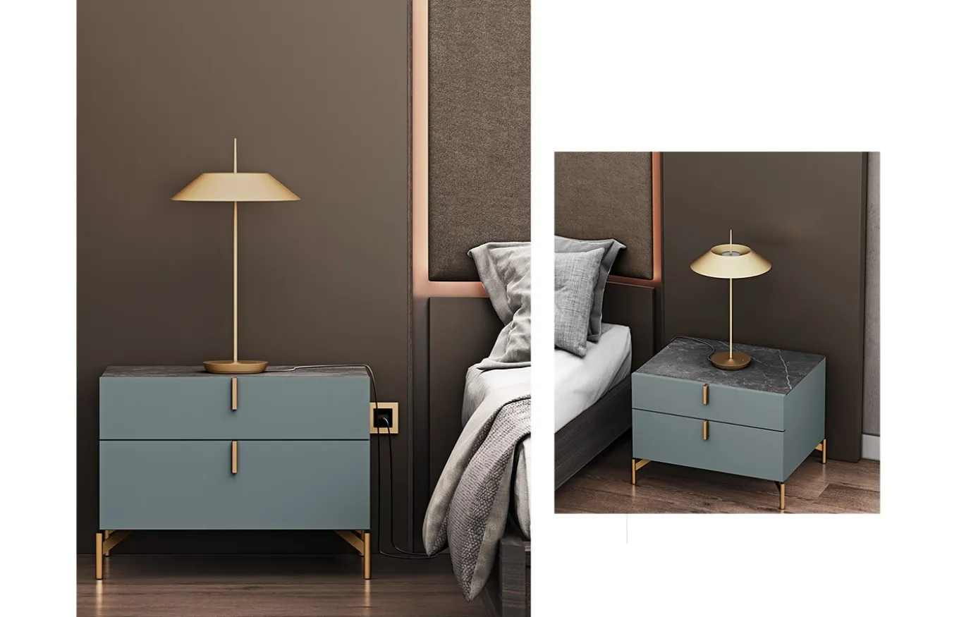- Mesita de 2 cajones extraíbles en acabado Egeo con tirador y patas en Oro. Su tapa tiene un acabado porcelánico Stone Gris.