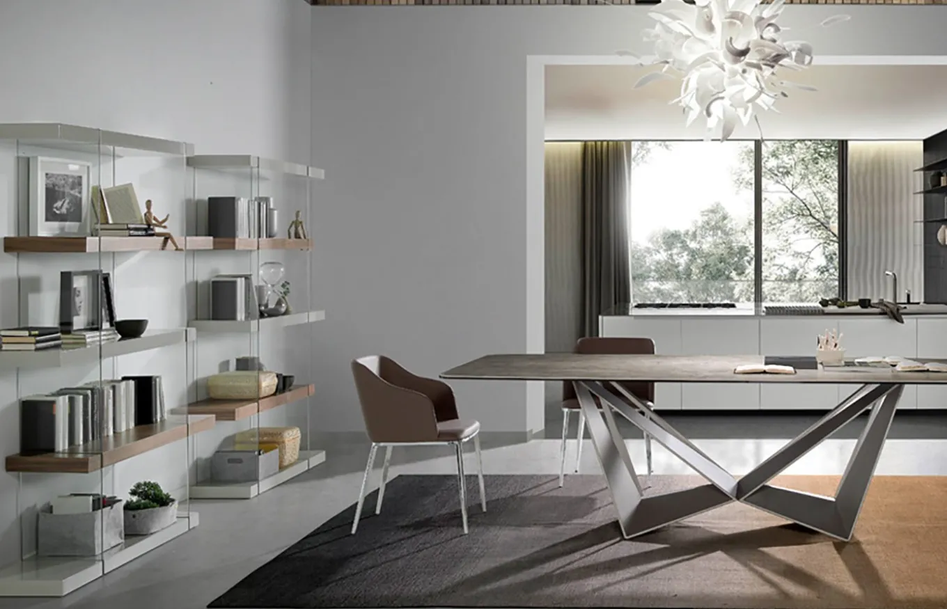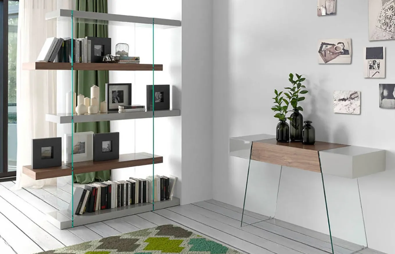 Diseño de líneas rectas, juega con la combinación de estantes de distinto acabado, y se arma en una estructura de cristal. Cada estante mide 140 cm de ancho con 6 cm de grosor y la distancia entre cada estante es de 36 cm. Su peso es de 80 kg.