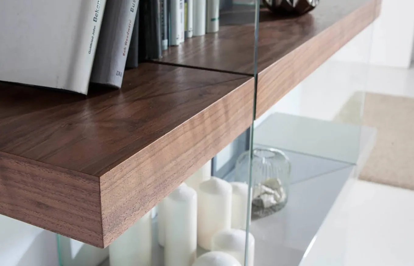 - Combinación de baldas en DM lacado Gris Perla Brillo y madera chapada en nogal natural de 0,5mm de espesor.