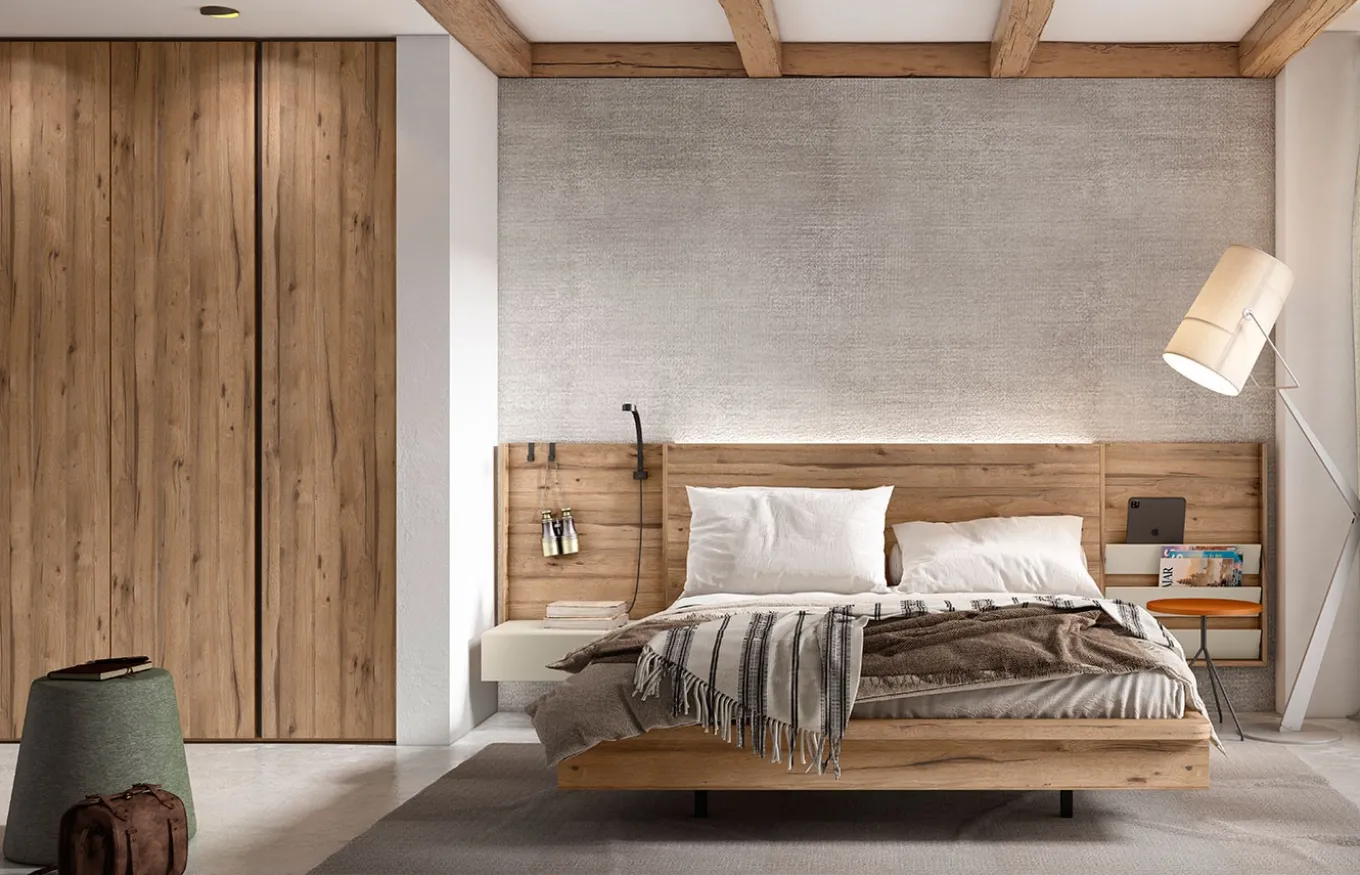 La habitación juvenil 20 llama la atención por el acabado completo en el mismo tono de la madera. Le acompañan dos mesitas de noche lacadas en colores neutros. Sin duda, esta habitación no pasa desapercibida.