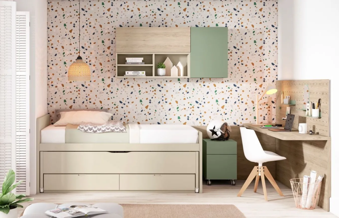 La habitación juvenil 23 de la colección Adapt de Lan Mobel es una opción versátil y moderna para adolescentes. Consta de una práctica bicama, ideal para compartir habitación, una mesa de escritorio con bordes curvos para estudiar cómodamente y una mesilla con ruedas para tener todo a mano.