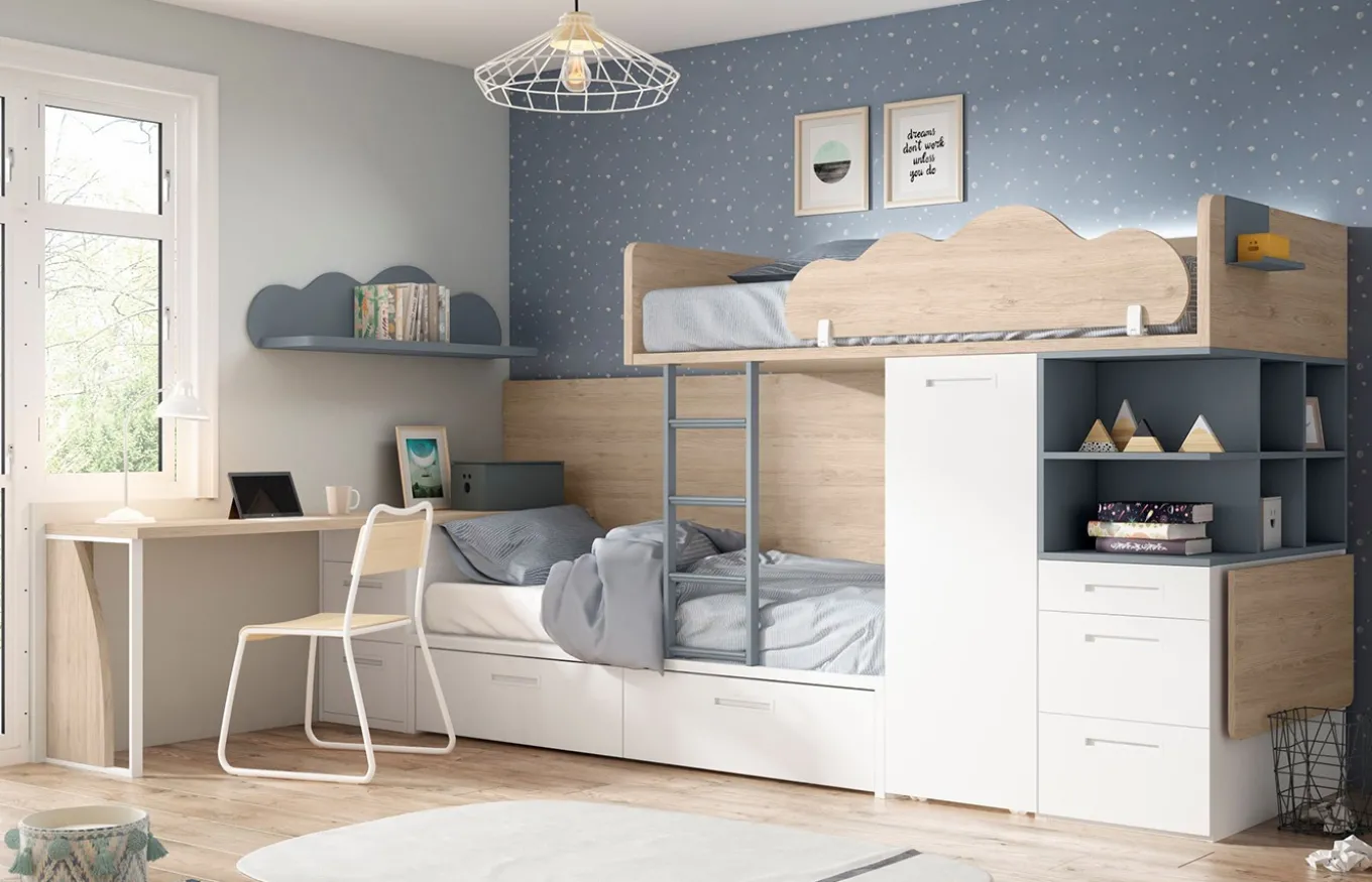 Con la cama tren de Lan Mobel podrás optimizar el espacio en la habitación de tus hijos. Las camas tren de Lan Mobel son una solución práctica y funcional para aprovechar al máximo el espacio en las habitaciones infantiles y juveniles. Ofrecen un sistema modular que combina dos camas, una superior y otra inferior, ubicadas una encima de la otra, liberando espacio en el suelo para otras actividades o para colocar muebles adicionales.