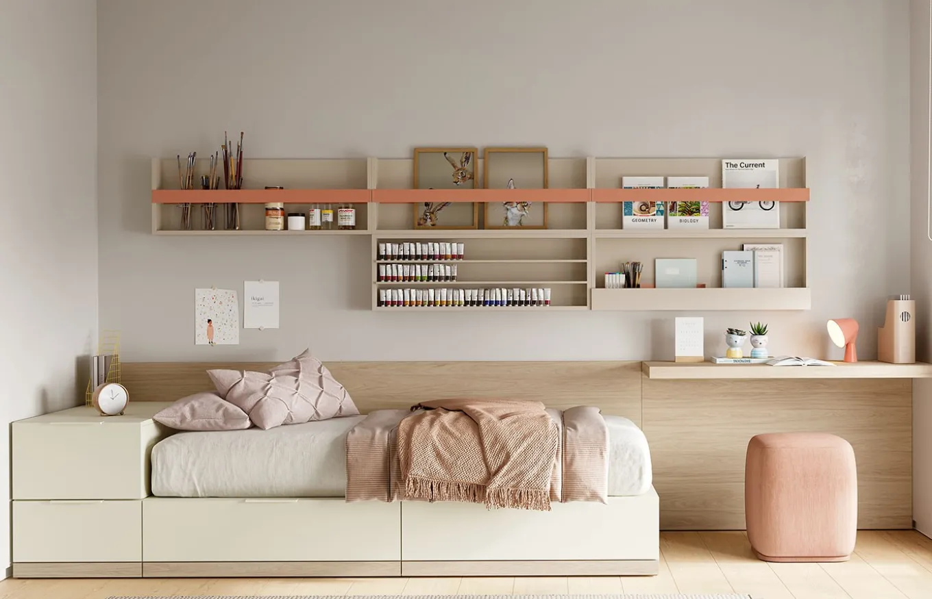 Cada habitación juvenil se adapta a las necesidades y gustos de cada cliente. La composición presentada es una medida predefinida, pero también ofrecemos la opción de personalizarla completamente. A continuación detallamos la habitación juvenil de la imagen adjunta: