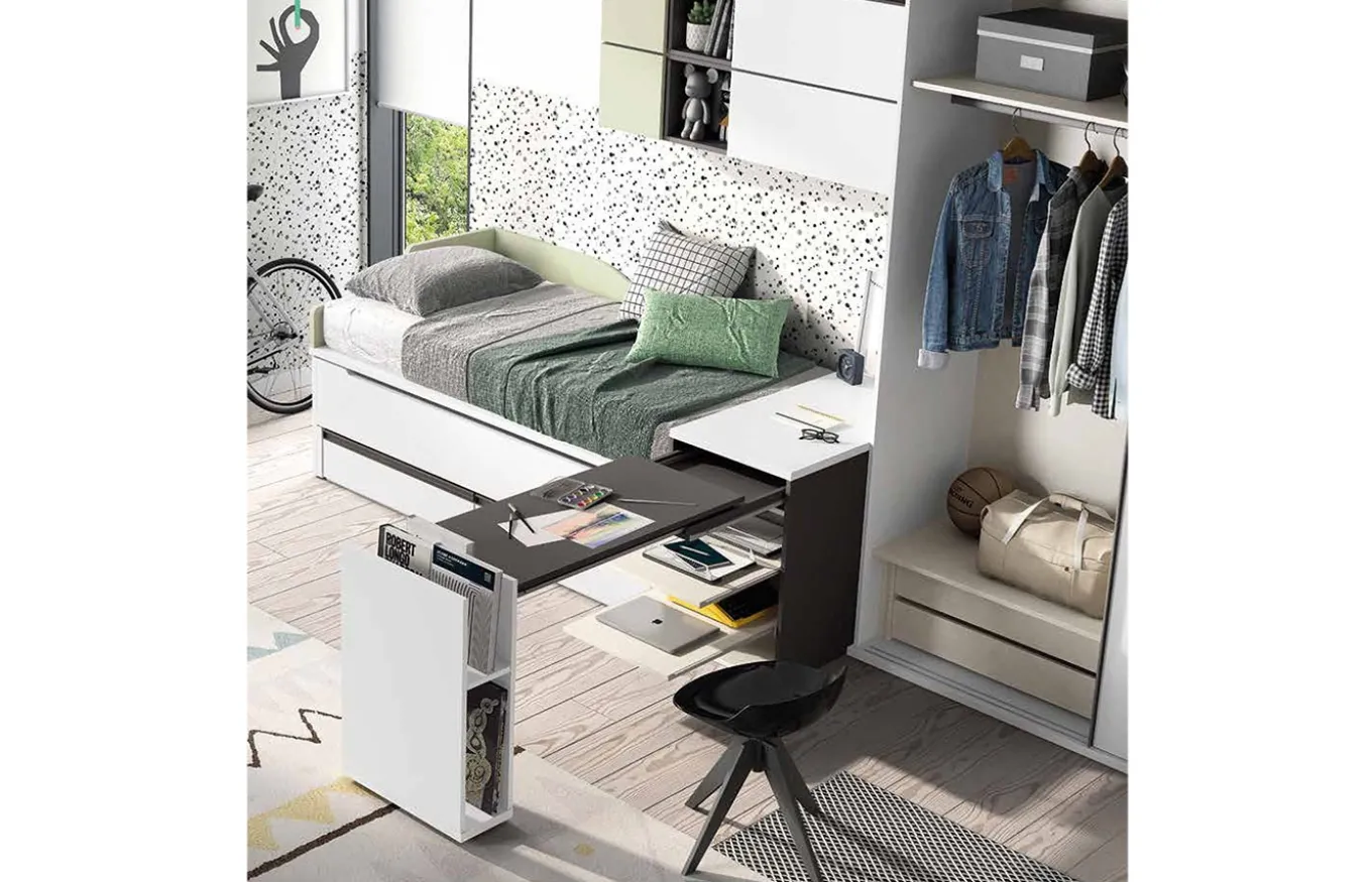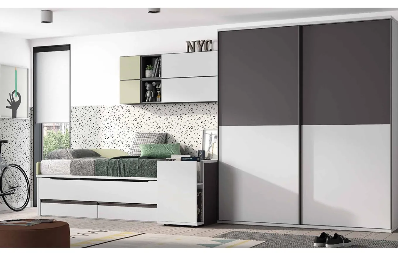 Habitación juvenil con compacto Style 05 fabricado por . Su diseño, de líneas rectas contrastadas con líneas curvas, recrean un espacio lleno de fantasía. Su armario de puertas correderas se adapta perfectamente a tus necesidades, en su interior hay dos cajones y el espacio es bastante amplio. Su cama es compacta, y en su parte inferior hay dos cajones que permiten guardan los utensilios del dormitorio. La mesa de estudio es extraíble, es decir, actúa tanto de cabezal como de mesa.